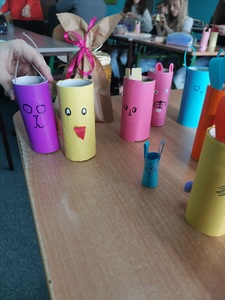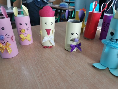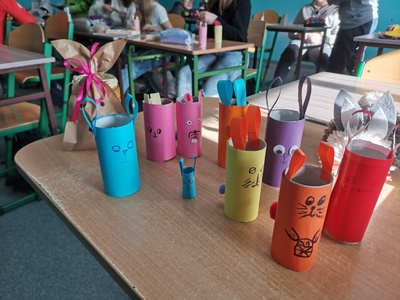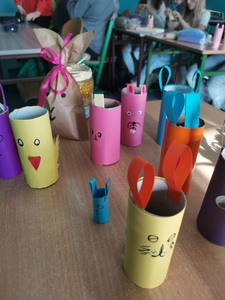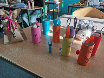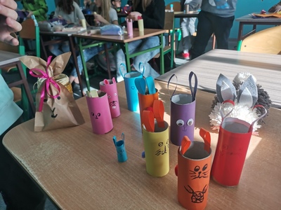W oczekiwaniu na „zajączka” klasa 5b na lekcjach techniki przygotowała zajączki i kyrczaki z papieru. Mamy nadzieję, że w dniu jutrzejszym zajączek wypełni ich koszyczki słodyczami i kolorowymi jajeczkami.