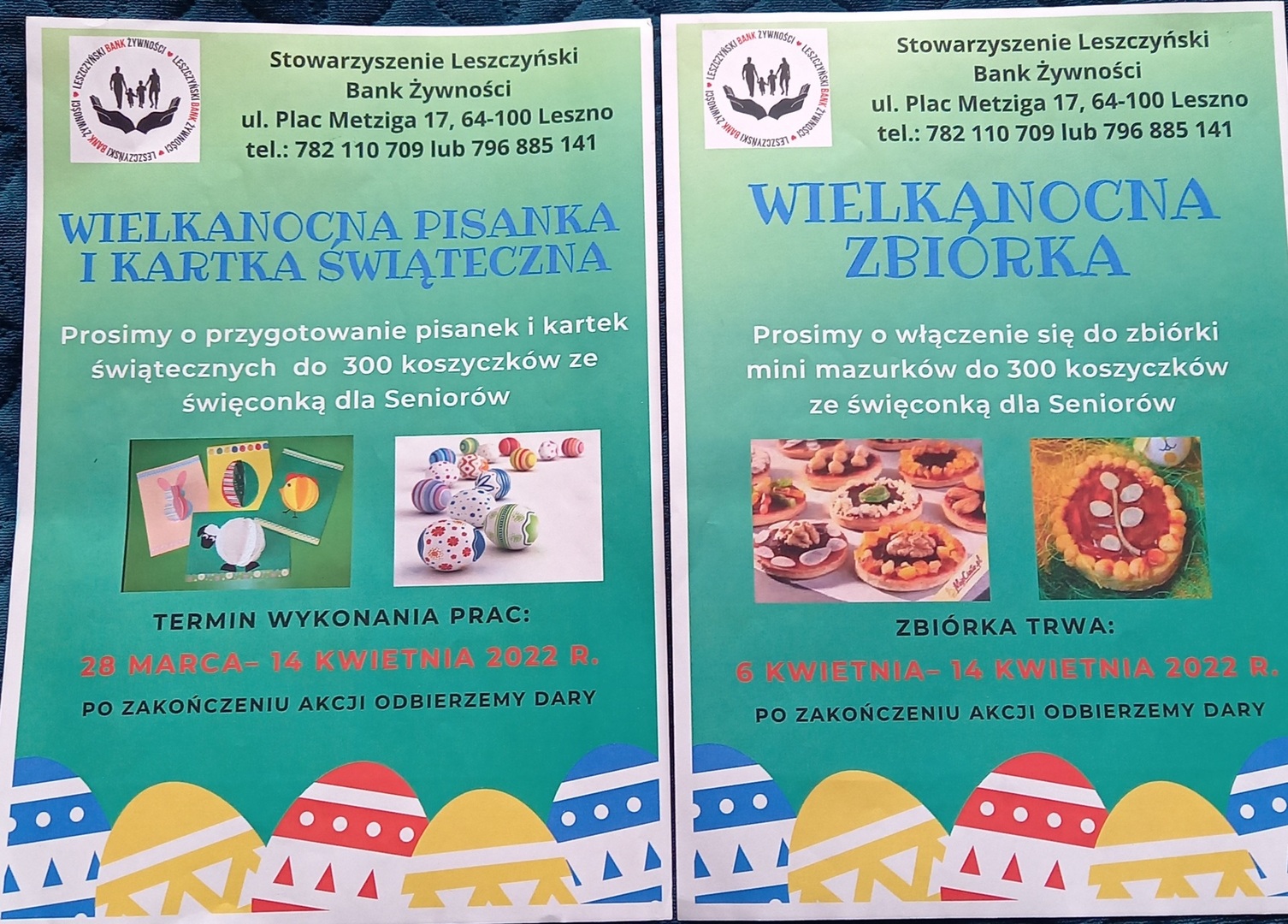 Nasza Szkoła włączyła się w wielkanocną zbiórkę organizowaną przez Leszczyński Bank Żywności w Lesznie. Zbiórka obejmowała mini mazurki oraz kartki i pisanki świąteczne do koszyczków ze święconką dla Seniorów. Udało się zebrać dosyć pokaźną liczbę mazurków i kartek świątecznych. Za wykonane kartki dziękuję uczniom klasy 1b, 2a oraz 2b wraz ze swoimi wychowawcami p. Anną Januszko, p. Hanną Kłysz oraz p. Renatą Stankiewicz.