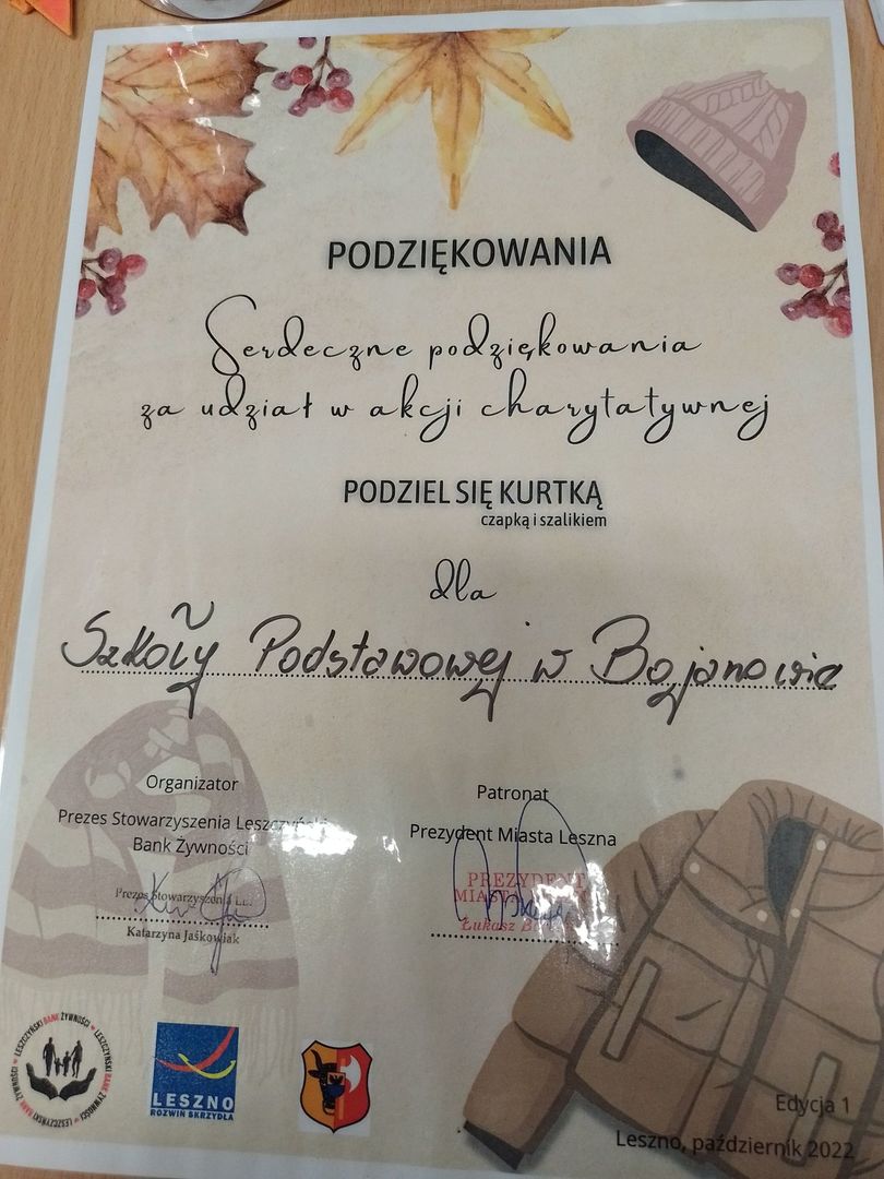 W dniach 17 – 21 października 2022 roku nasza szkoła dołączyła do akcji zbiórki kurtek, czapek, szalików i rękawiczek, organizowanej przezStowarzyszenie Leszczyński Bank Żywności. Zebrane dary mają trafić do osób, które takiej odzieży potrzebują. Po raz kolejny nasi uczniowie udowodnili, że mają wielkie serca i chętnie pomagaja osobom w potrzebie. Wszystkie zebrane przez nas rzeczy zostały odebrane w poniedziałek przez pracowników Leszczyńskiego Banku Żywności. Dary zostana rozdane we wtorek i środę w Lesznie na Placu Metziga osobom potrzebujacym.