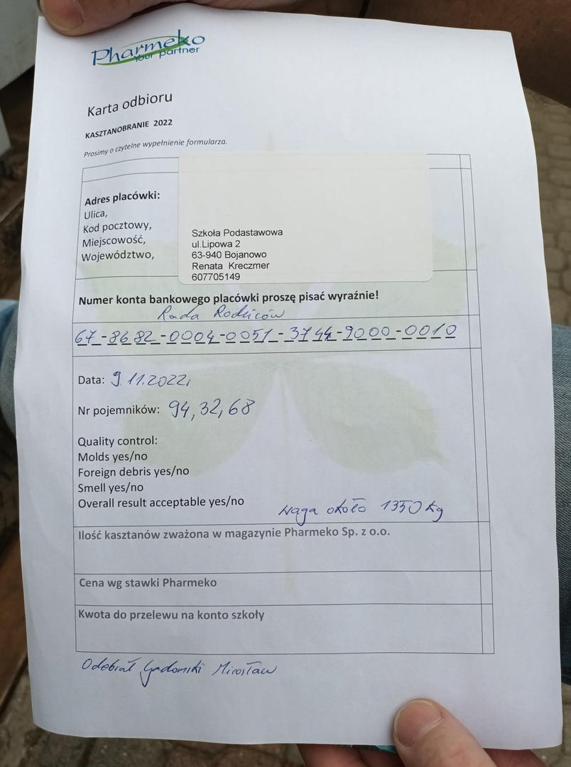 Zebrane przez Was kasztany pojechały do firmy Pharmeko, która dokładnie je zważy i przekaże pieniądze na konto Rady Rodziców.