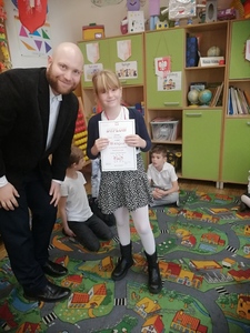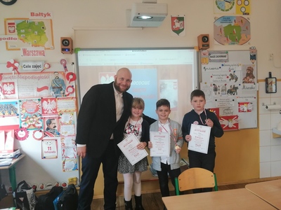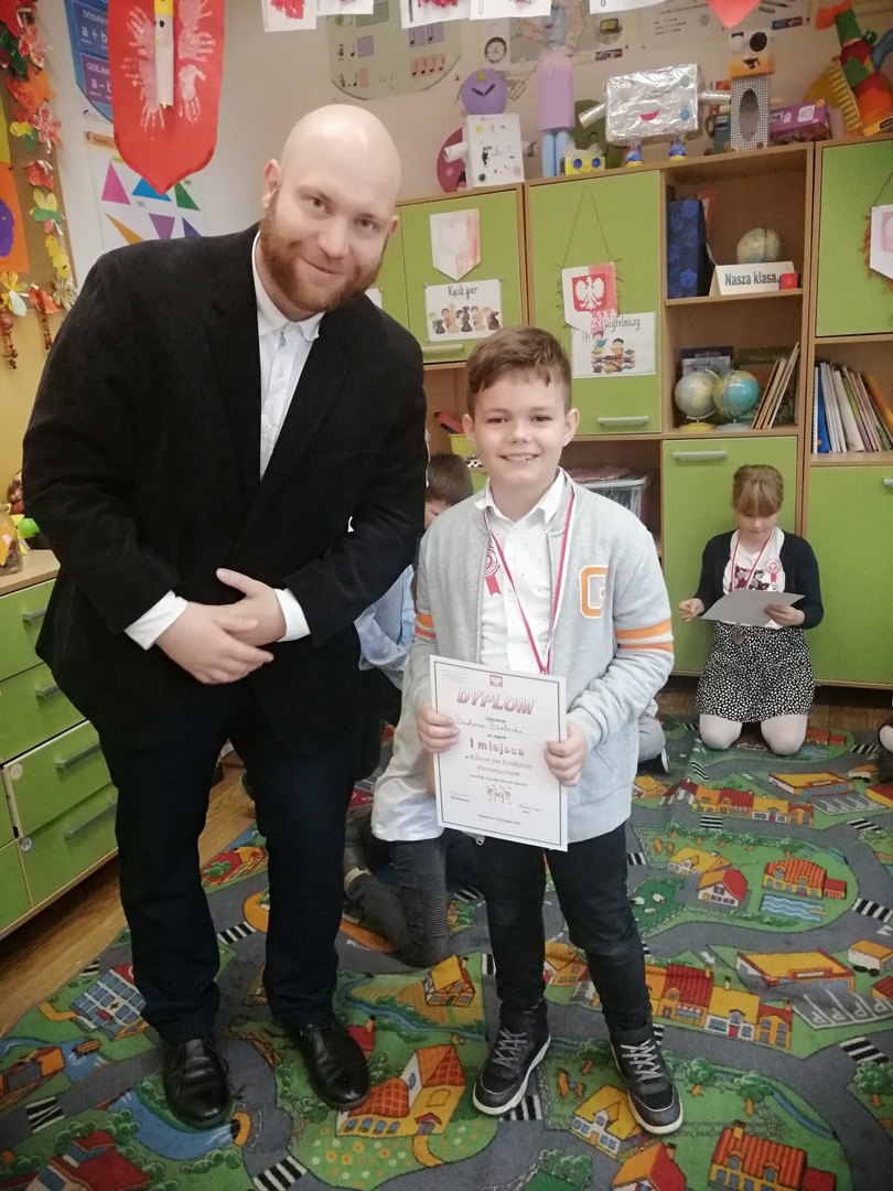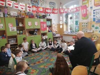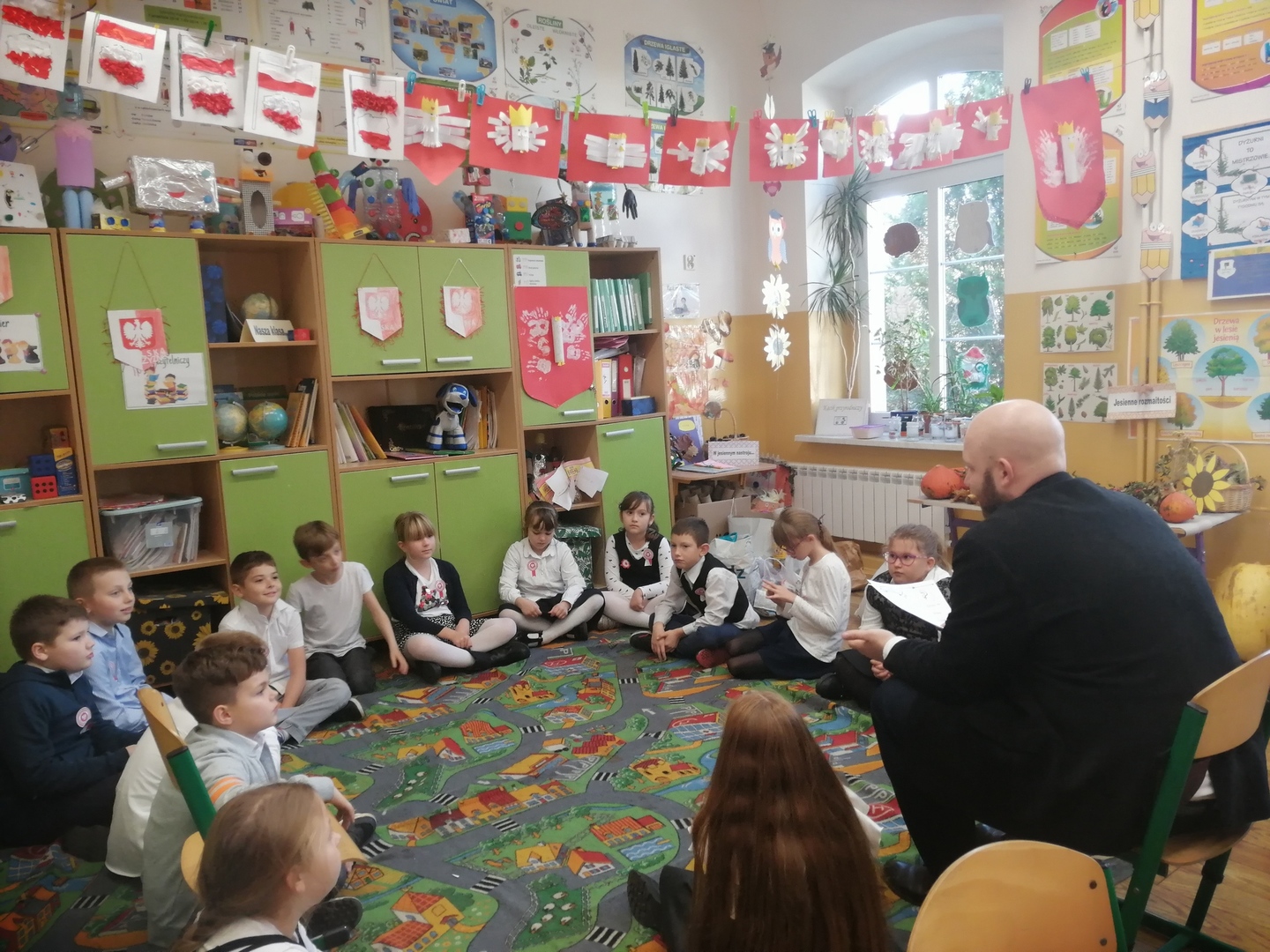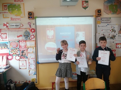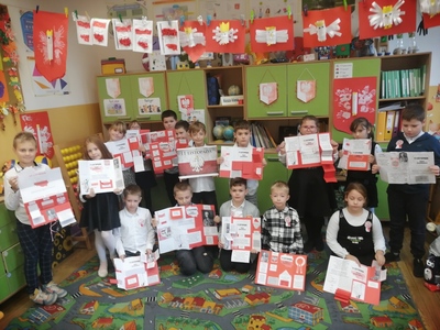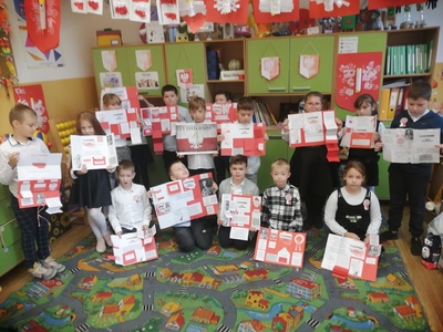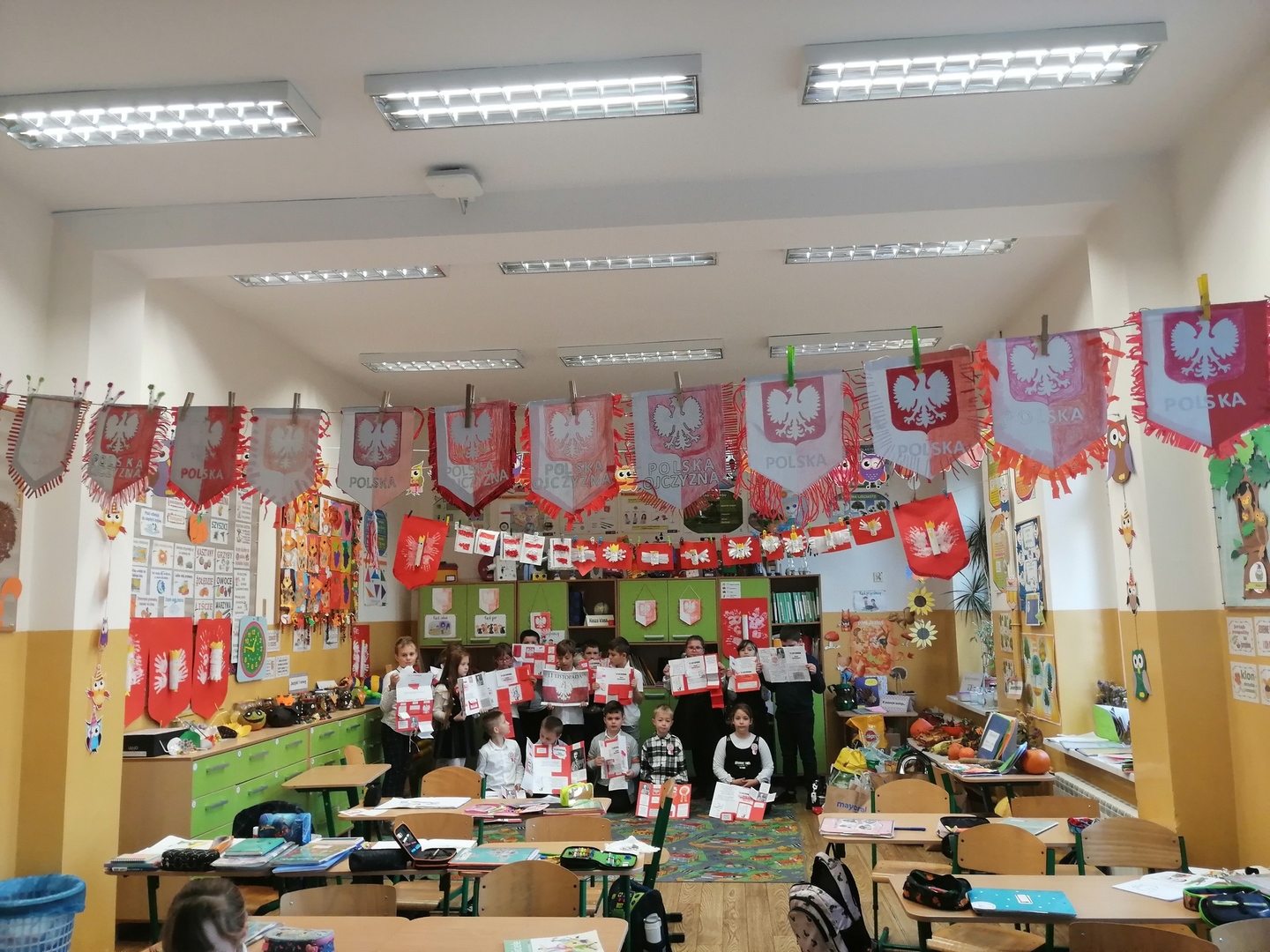 Uczniowie klasy II b na zajęciach poprzedzających Narodowe Święto Niepodległości, mówili o przynależności do społeczności patriotycznej oraz o kształtowaniu prawidłowych postaw wobec Ojczyzny. Poznawali i omawiali symbole narodowe oraz postacie takie jak m.in. Józef Wybicki czy Józef Piłsudski. Wykonali również prace plastyczno- techniczne, przedstawiające nasze godło, chorągiewki biało- czerwone czy proporczyki narodowe. Wiele radości dało dzieciom wykonanie lapbooków o tematyce dotyczącej naszej ojczyzny i Święta Niepodległości. Młodsi uczniowie mogli w ten sposób wzbogacić , jak i utrwalić wiedzę o swoim kraju. W tym dniu uczniowie mieli okazję bliżej poznać p. Mikołaja Fiebicha- nauczyciela historii, który z przyjemnością przyjął nasze zaproszenie na zajęcia. Po krótkiej – bardzo interesującej pogadance , nasz gość przeprowadził konkurs wiedzy o Polsce. Zagadnienia były bardzo obszerne , ale mali uczniowie wykazali się dużą wiedzą i wyłonienie laureatów, nie było wcale takie proste. Ale udało się!