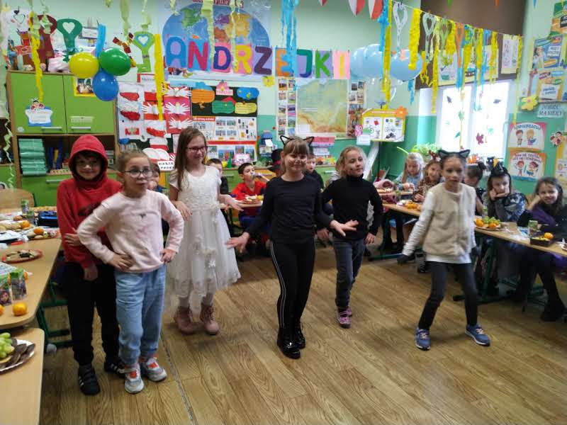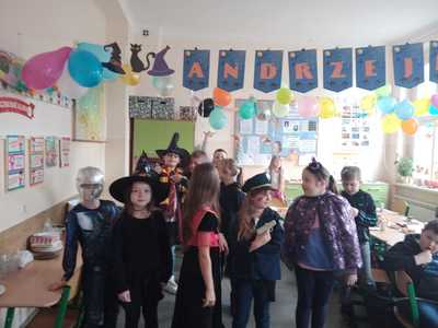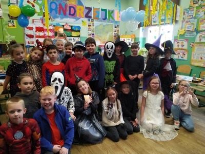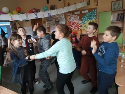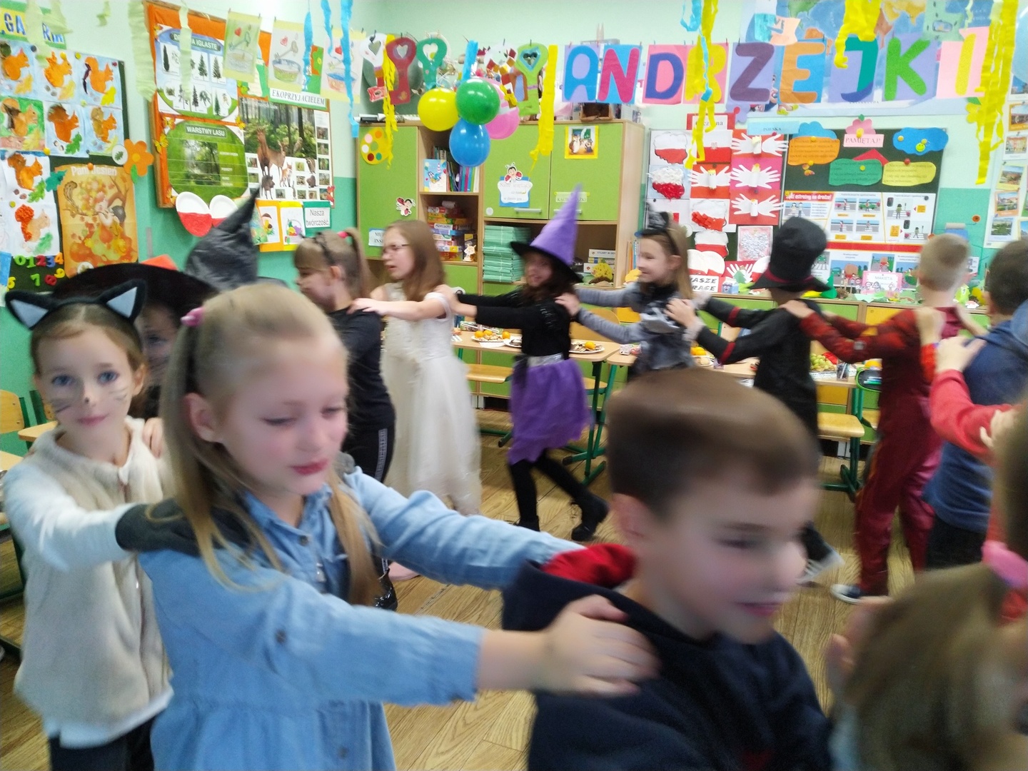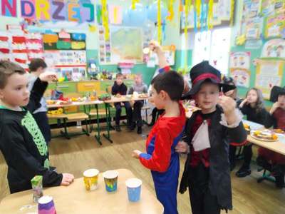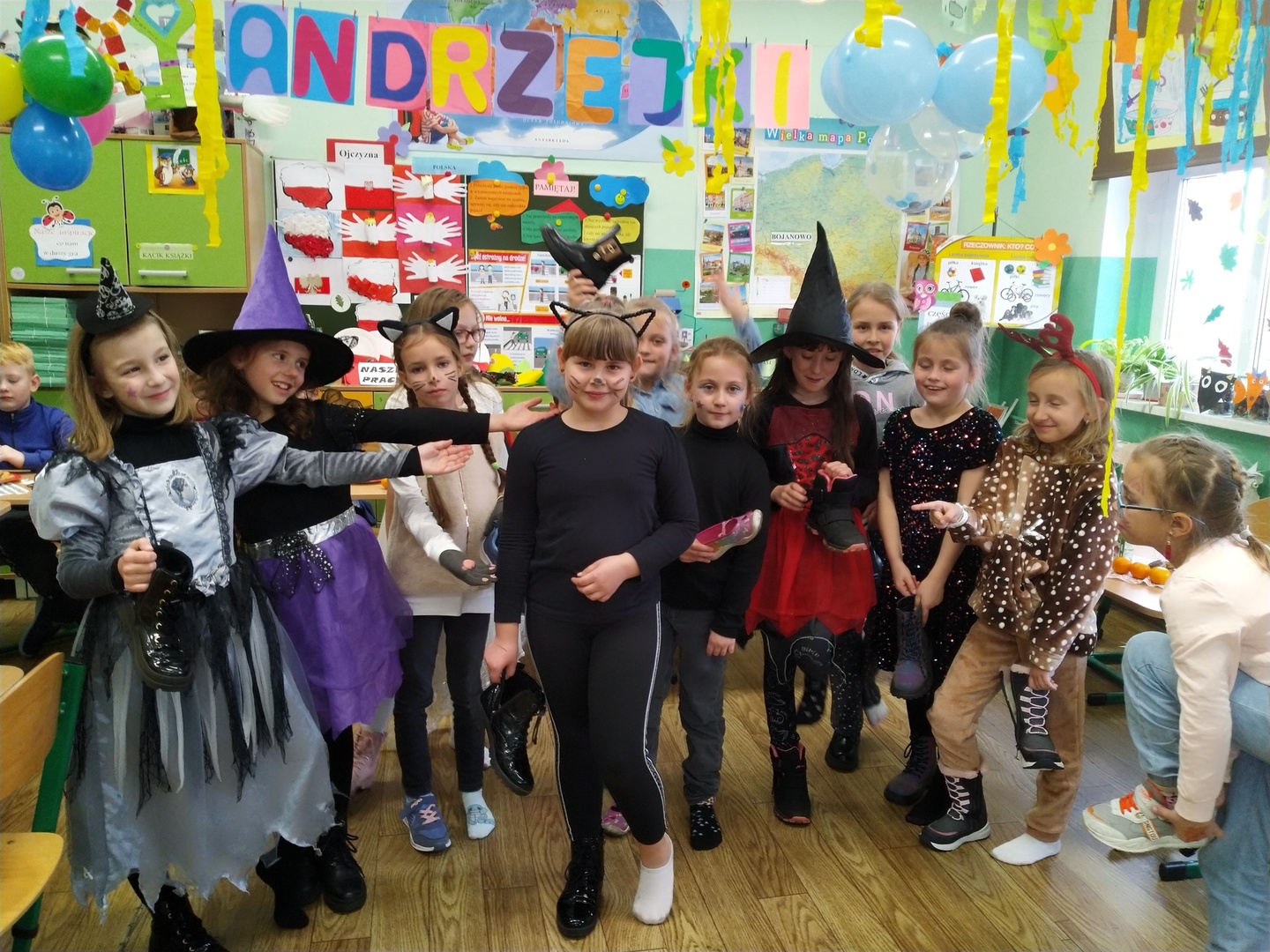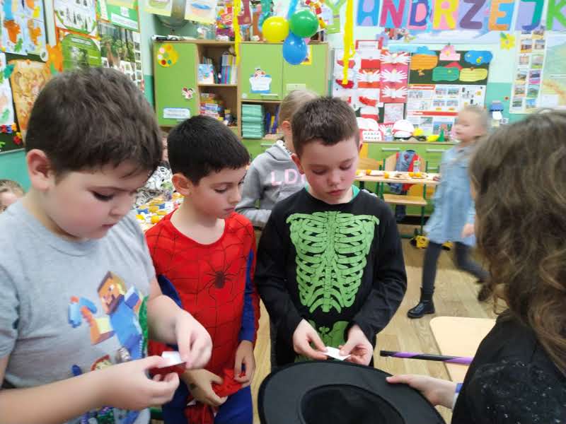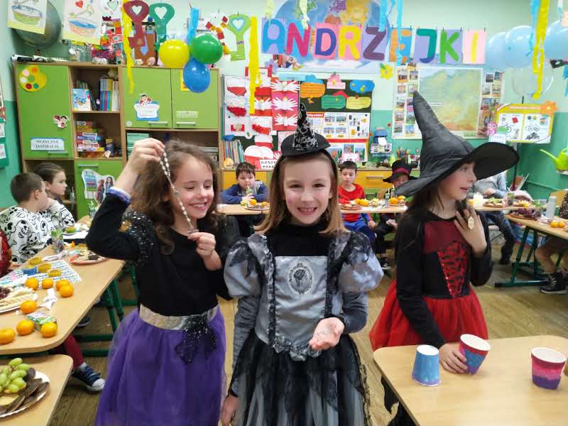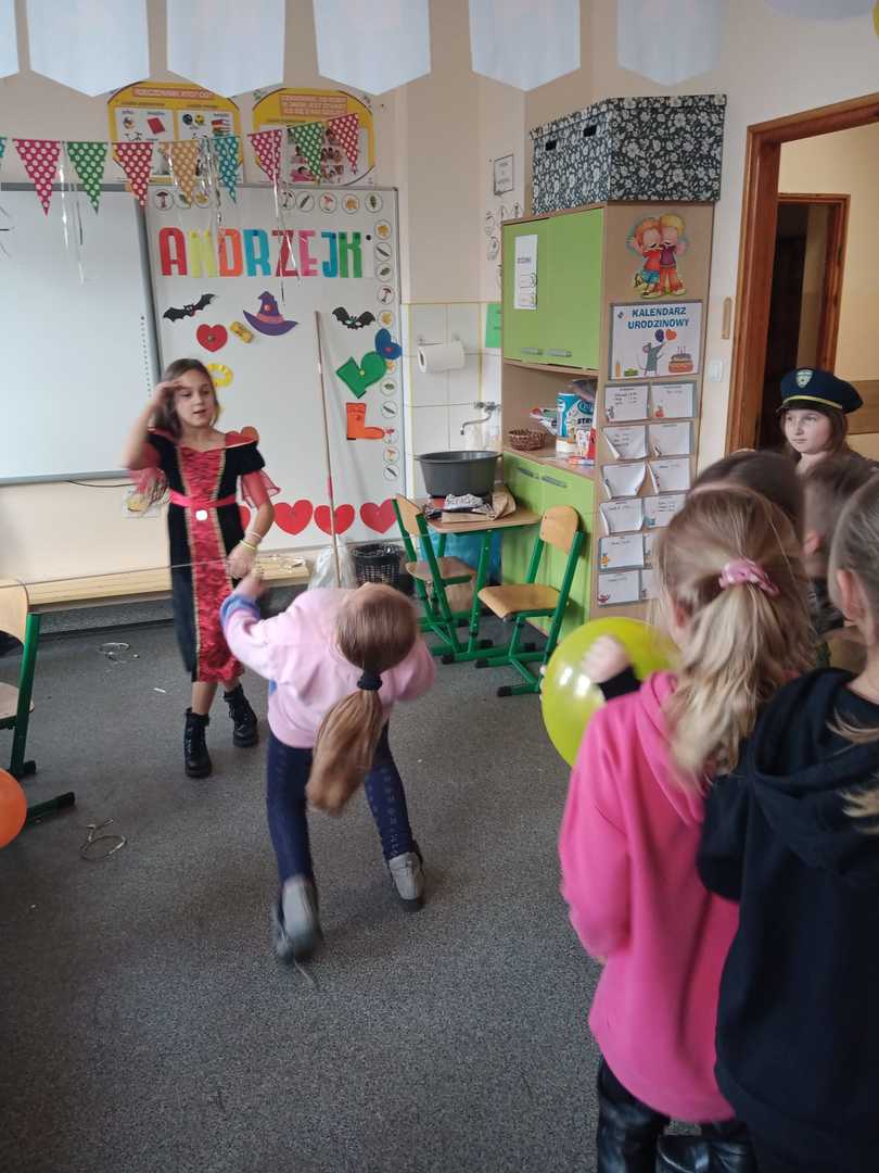 Magiczna andrzejkowa atmosfera zapanowała w klasach I-III. Zanim przystąpiono do wróżb, dzieci poznały historię tego święta, wróżby z różnych regionów Polski. Aby umilić nam ten czas rodzice zadbali o słodki poczęstunek. Po poczęstunku nadszedł czas na wróżby i zabawy andrzejkowe. Każdy chciał dowiedzieć się, co go czeka w przyszłości. Dzieci przekłuwały serduszka z imionami, poznawały swoje przyszłe zawody, magię liczb. Oczywiście nie mogło zabraknąć wróżby z butami. Bardzo dużym powodzeniem cieszyła się wróżba z miską wody ,monetą i gwiazdą. Każdy chciał, aby moneta wpadła do wody i spełniło się marzenie. Podczas tych wróżb było mnóstwo śmiechu i zabawy, bo przecież wiemy, że należy je traktować z ,,przymrużeniem oka”. Najważniejsze, że miło spędziliśmy czas i wszyscy dobrze się bawili. Oczywiście oprócz wróżb odbyły się także zabawy taneczne. „Gorące krzesła”, taniec z balonikami , taniec z miotłą to tylko niektóre z nich.
