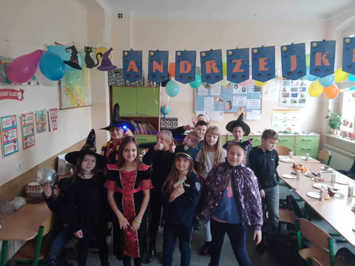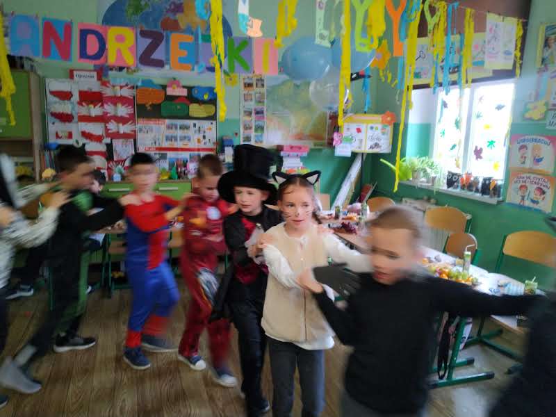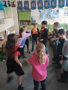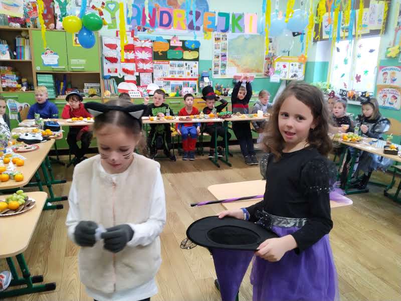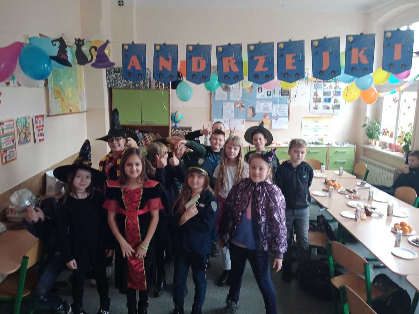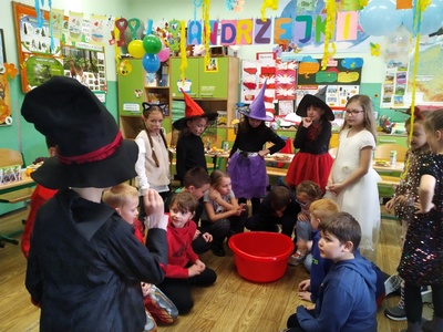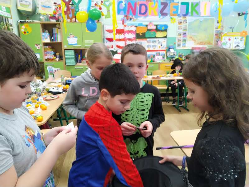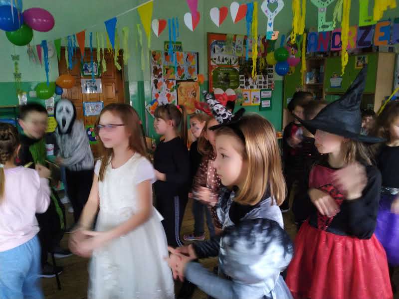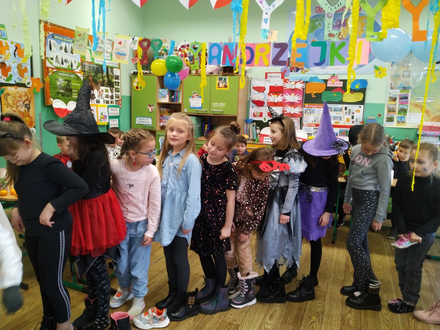 Magiczna andrzejkowa atmosfera zapanowała w klasach I-III. Zanim przystąpiono do wróżb, dzieci poznały historię tego święta, wróżby z różnych regionów Polski. Aby umilić nam ten czas rodzice zadbali o słodki poczęstunek. Po poczęstunku nadszedł czas na wróżby i zabawy andrzejkowe. Każdy chciał dowiedzieć się, co go czeka w przyszłości. Dzieci przekłuwały serduszka z imionami, poznawały swoje przyszłe zawody, magię liczb. Oczywiście nie mogło zabraknąć wróżby z butami. Bardzo dużym powodzeniem cieszyła się wróżba z miską wody ,monetą i gwiazdą. Każdy chciał, aby moneta wpadła do wody i spełniło się marzenie. Podczas tych wróżb było mnóstwo śmiechu i zabawy, bo przecież wiemy, że należy je traktować z ,,przymrużeniem oka”. Najważniejsze, że miło spędziliśmy czas i wszyscy dobrze się bawili. Oczywiście oprócz wróżb odbyły się także zabawy taneczne. „Gorące krzesła”, taniec z balonikami , taniec z miotłą to tylko niektóre z nich.