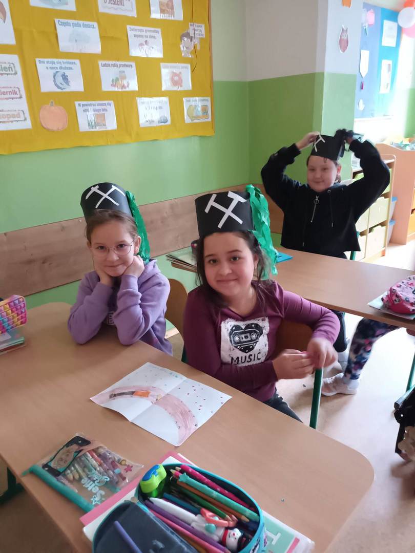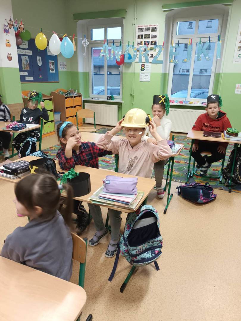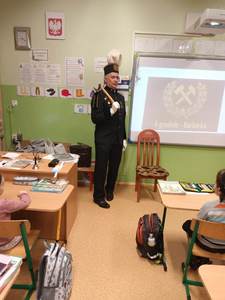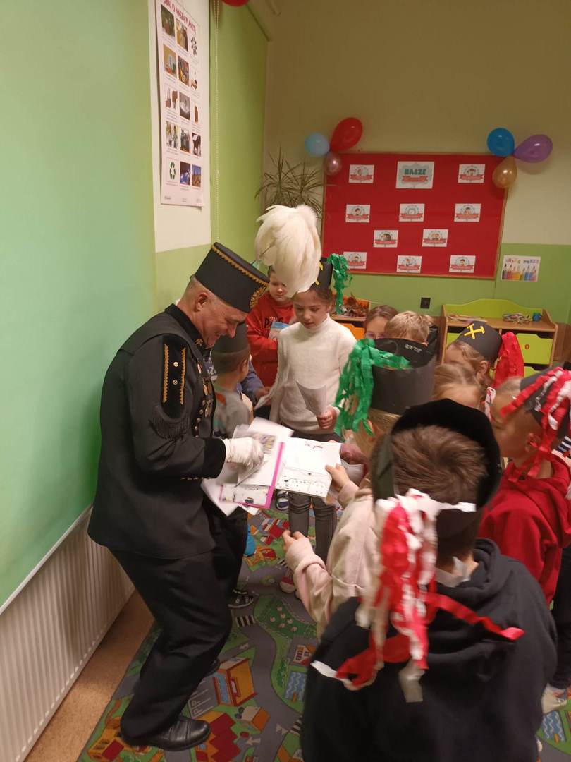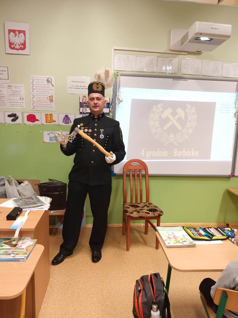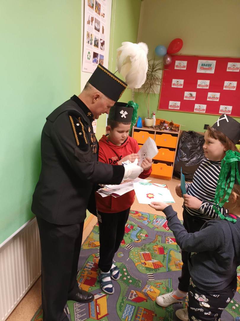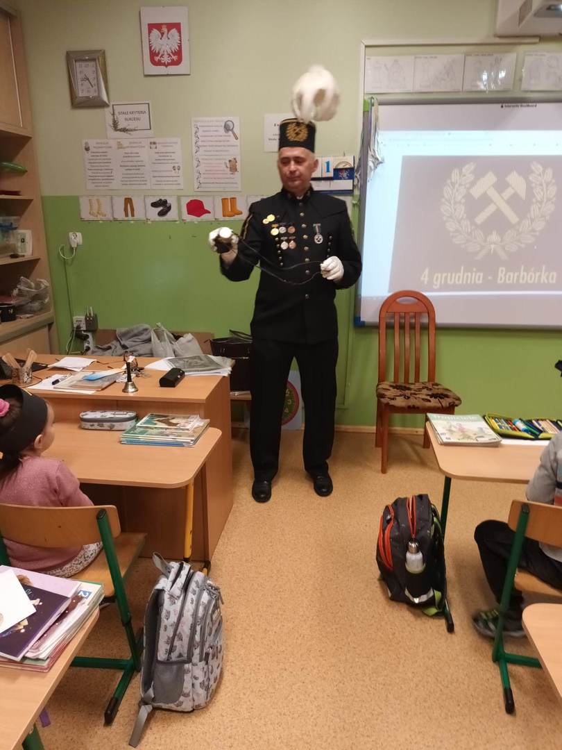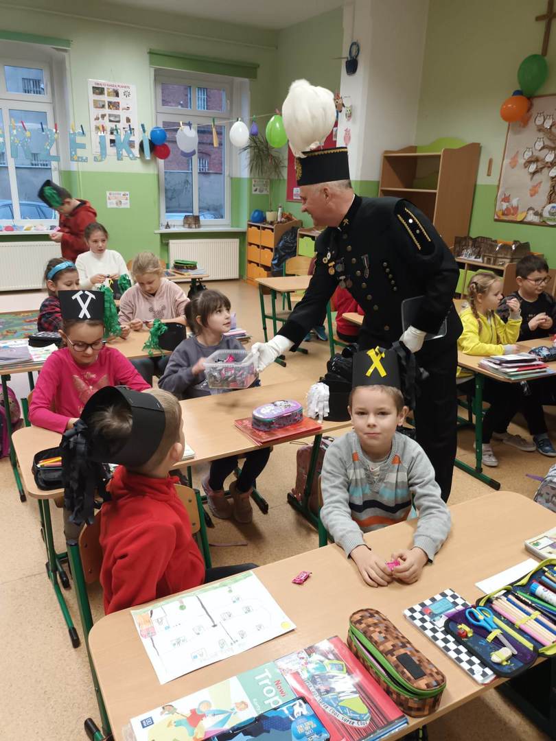 się wieloma ciekawostkami. Przyniósł ze sobą metanomierz umożliwiający badanie stężenia metanu pod ziemią, anemometr górniczy służący do mierzenia prędkości powietrza w danym wyrobisku oraz dużą bryłę węgla. Dzieci miały okazję spróbować górniczych cukierków, którymi zostały poczęstowane. Uczniowie z zaciekawieniem słuchali historii o św. Barbarze, patronce górników.