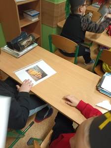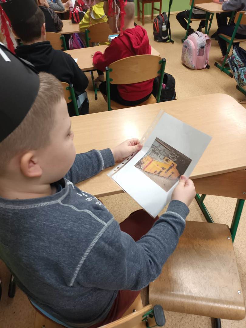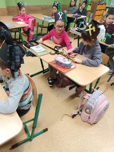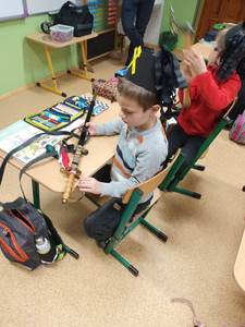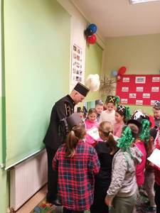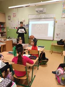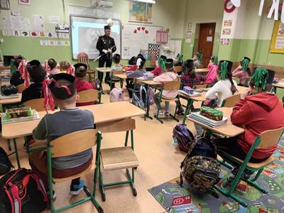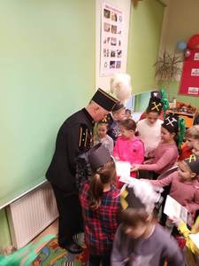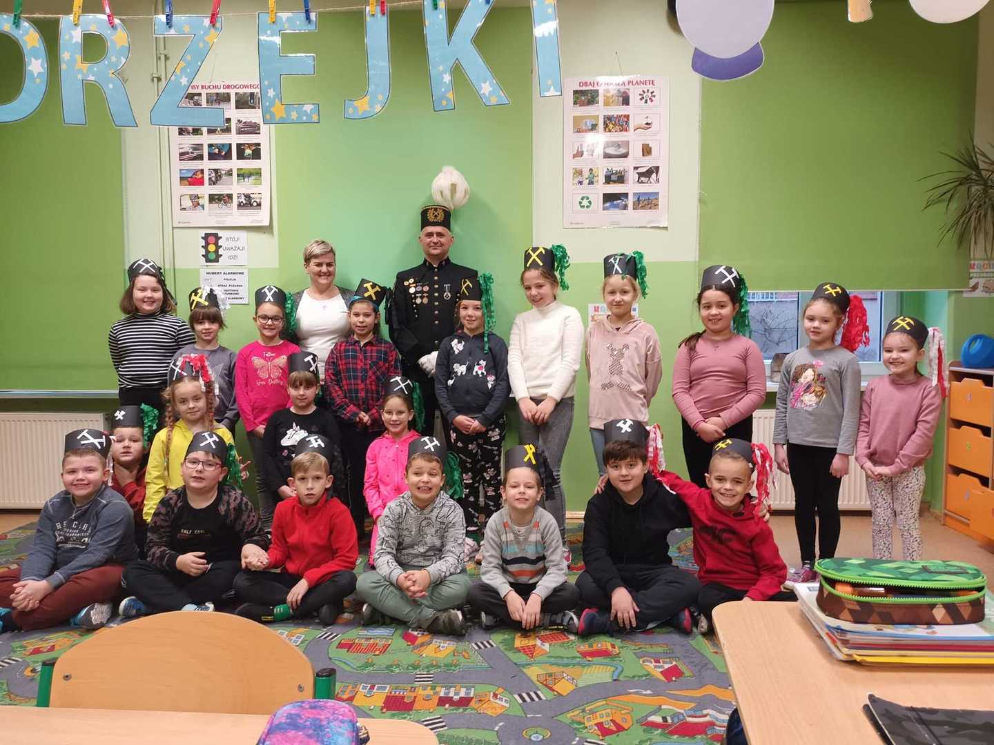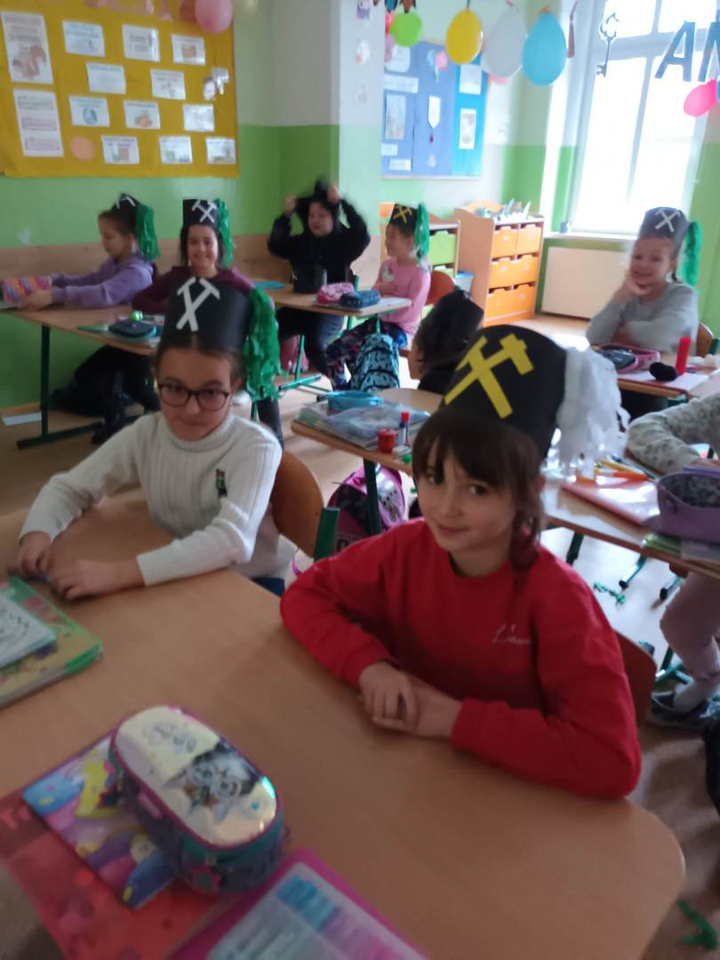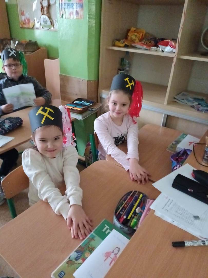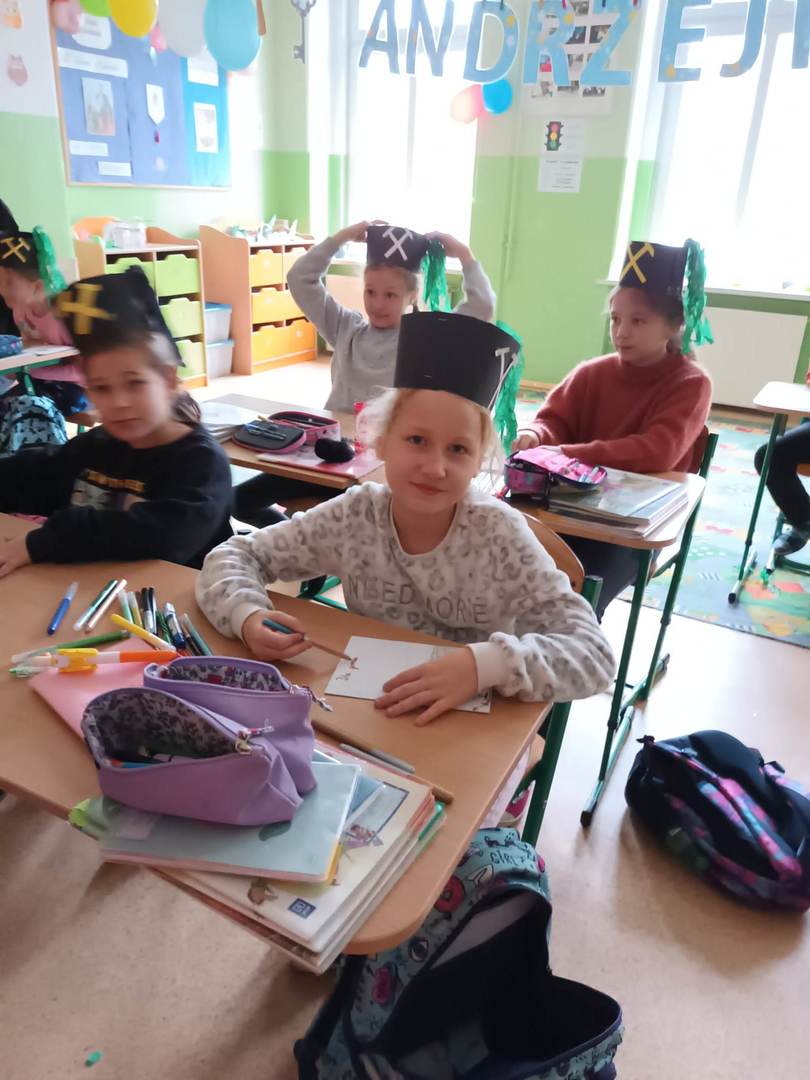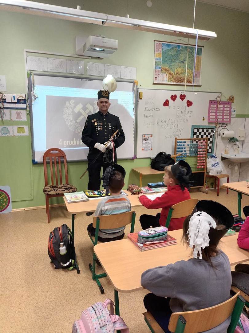 się wieloma ciekawostkami. Przyniósł ze sobą metanomierz umożliwiający badanie stężenia metanu pod ziemią, anemometr górniczy służący do mierzenia prędkości powietrza w danym wyrobisku oraz dużą bryłę węgla. Dzieci miały okazję spróbować górniczych cukierków, którymi zostały poczęstowane. Uczniowie z zaciekawieniem słuchali historii o św. Barbarze, patronce górników.