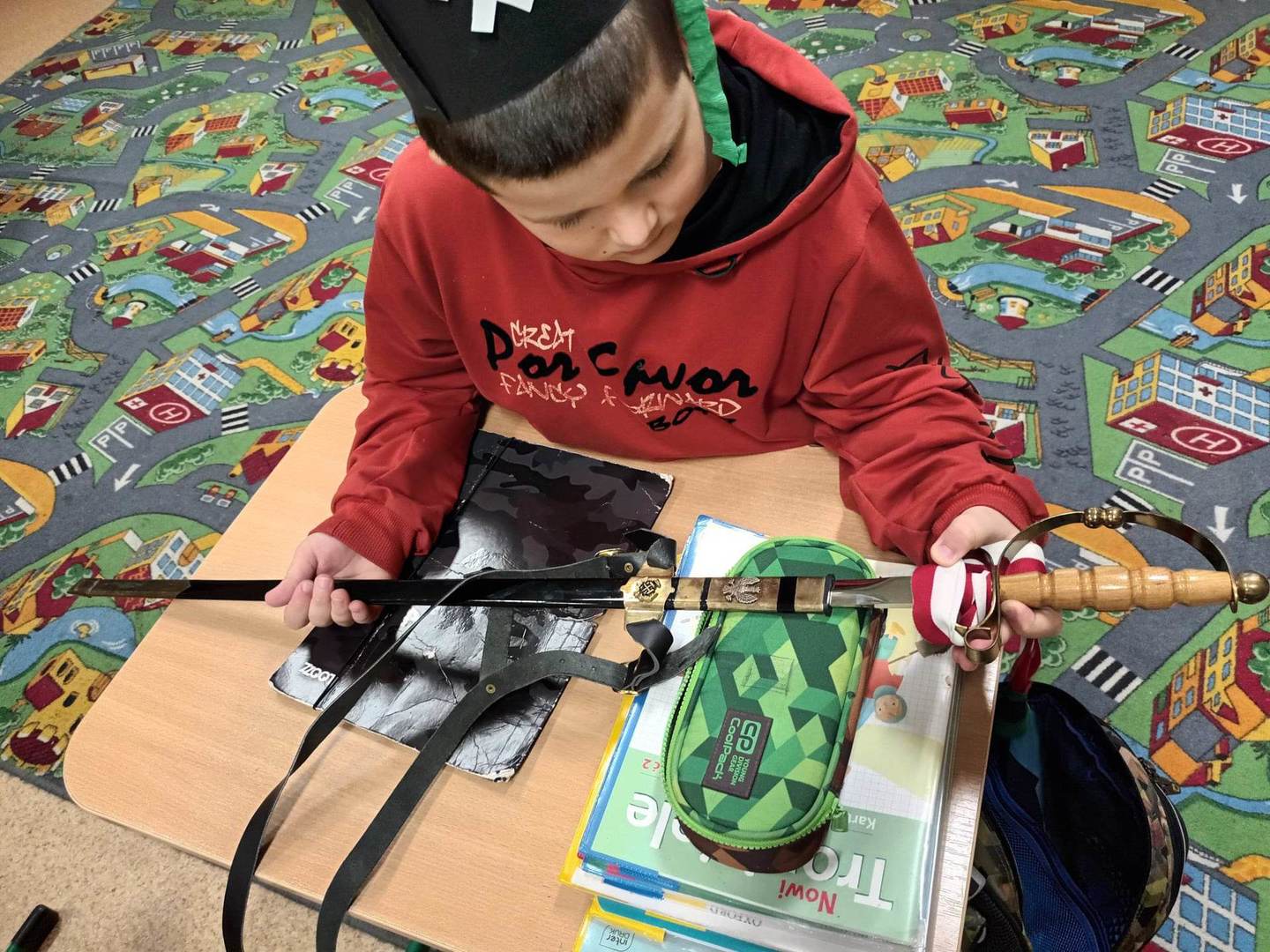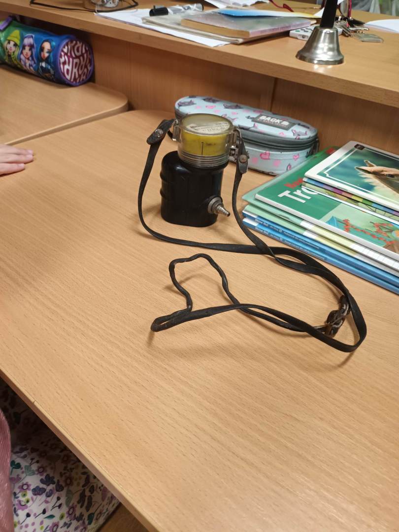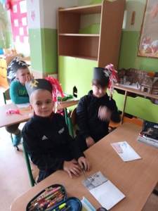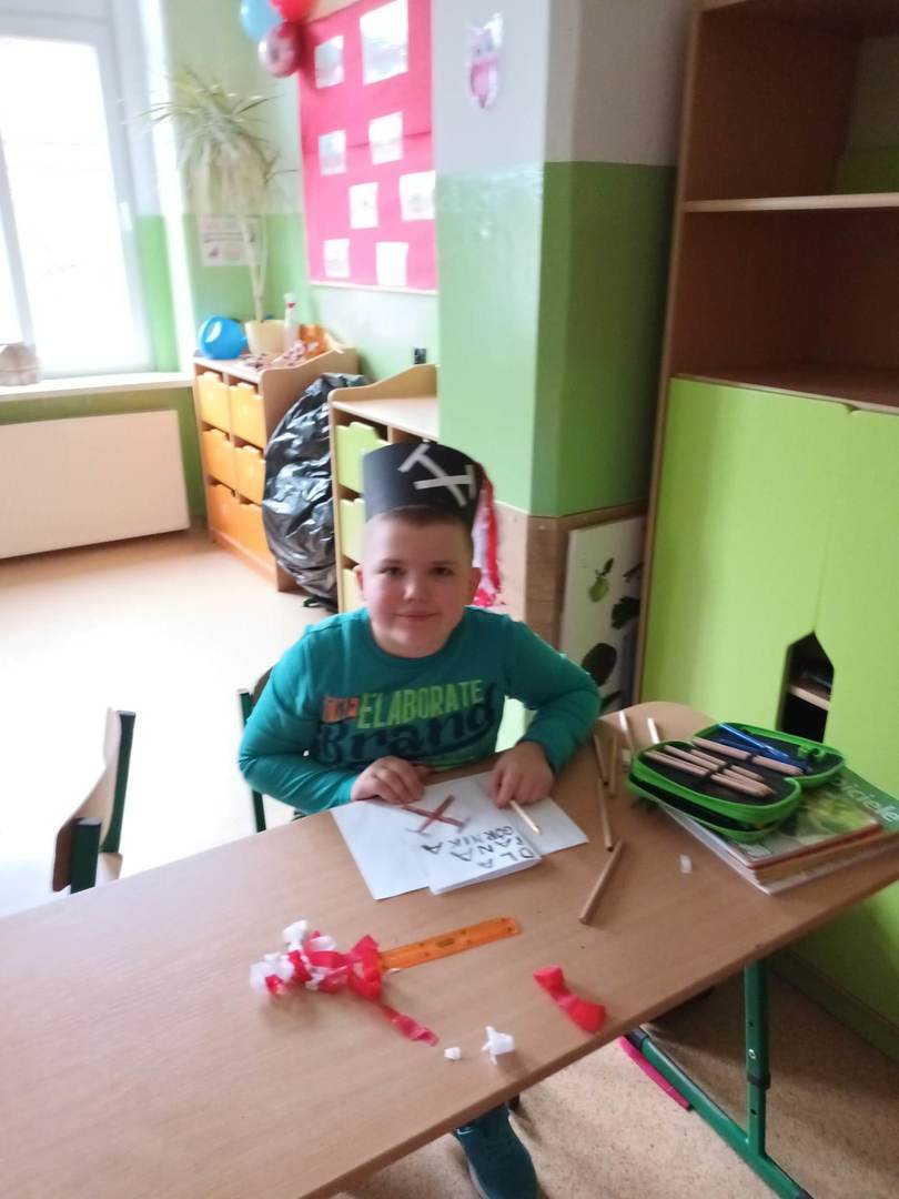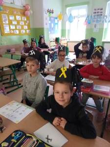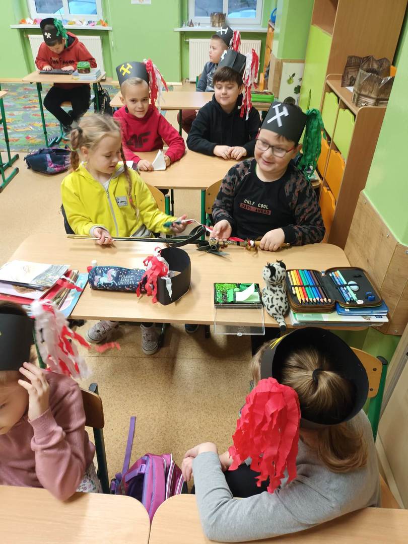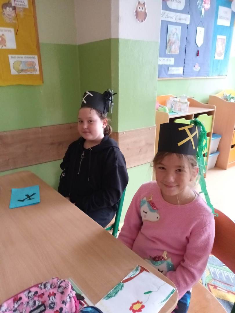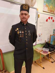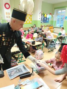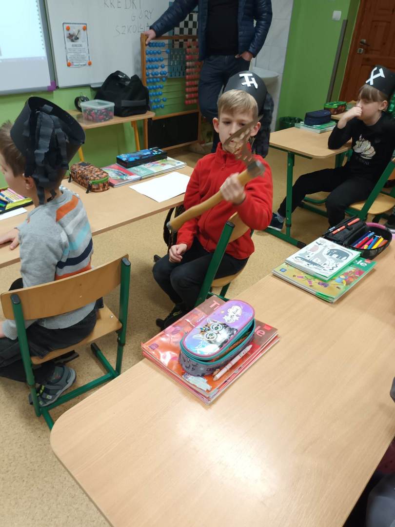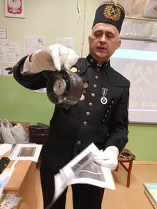 i pióropuszem z kogucich piór oraz odznaczeniom Pana Dariusza za długoletnią pracę w kopalni. Uczniowie mogli również dotknąć szabli, którą otrzymują tylko zasłużeni górnicy, toporka górniczego oraz przymierzyć hełm górniczy.