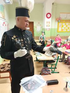 Gość przybył w galowym stroju, który górnicy zakładają na szczególne okazje. Uczniowie przyjrzeli się z bliska czapce zwanej czako z godłem górniczym