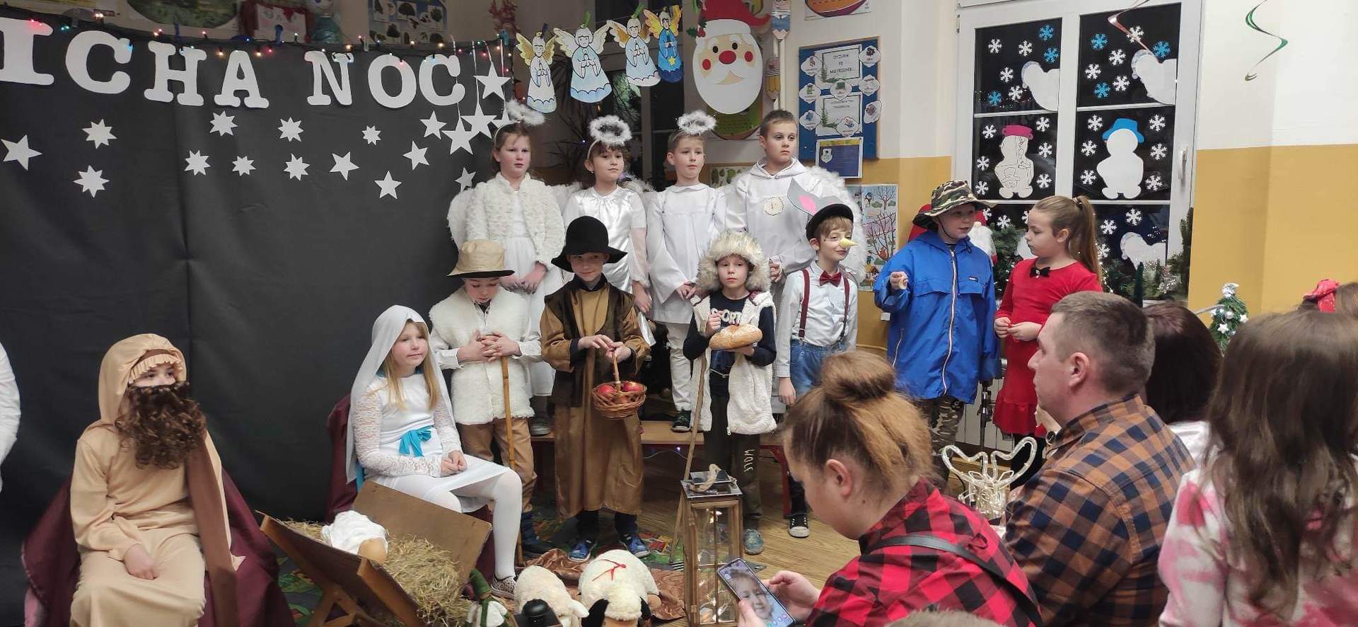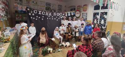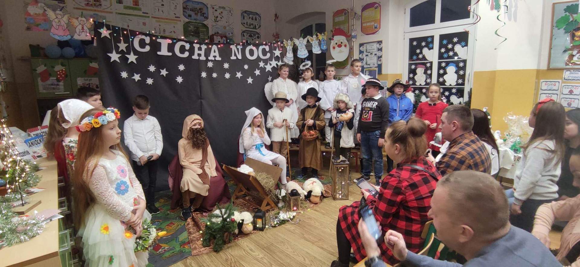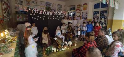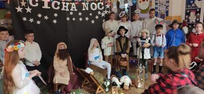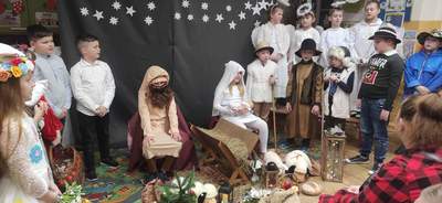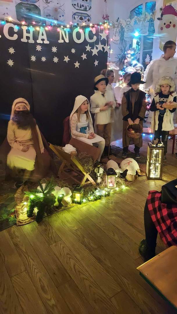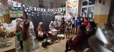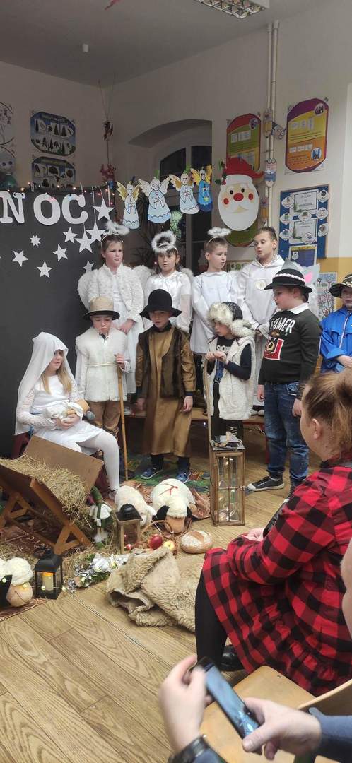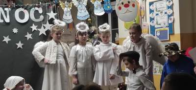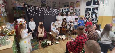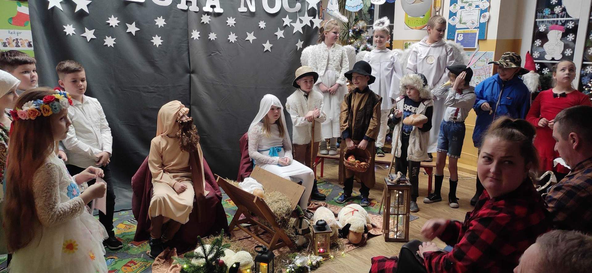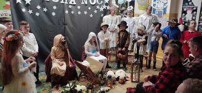 We wtorek 20 grudnia odbyły się jasełka „Betlejemska dobranocka” przygotowane przez uczniów klasy II b. Dzieci z dużym zaangażowaniem odgrywały swoje role i przeżywały magię Świąt Bożego Narodzenia. Jak powszechnie wiadomo, Święta Bożego Narodzenia są najbardziej rodzinnymi i ciepłymi świętami, pozwalającymi poczuć serdeczność i miłość wszystkich wokół. Wszyscy, zarówno dzieci jak i dorośli z niecierpliwością oczekują jego nadejścia. Uczniowie ku uciesze swoich rodziców, w pięknych strojach przedstawili historię narodzin Dzieciątka Jezus z udziałem bajkowych postaci, takich jak: Czerwony Kapturek, Pinokio, Calineczka, Sierotka Marysia, Jaś i Małgosia, czy Stary Rybak- oprawioną kolędami i pastorałkami. Po przedstawieniu dzieci zaprezentowały swoje zdolności muzyczne grając na dzwonkach wybrane kolędy. Na zakończenie dzieci wręczyły rodzicom przygotowane dla nich upominki.
