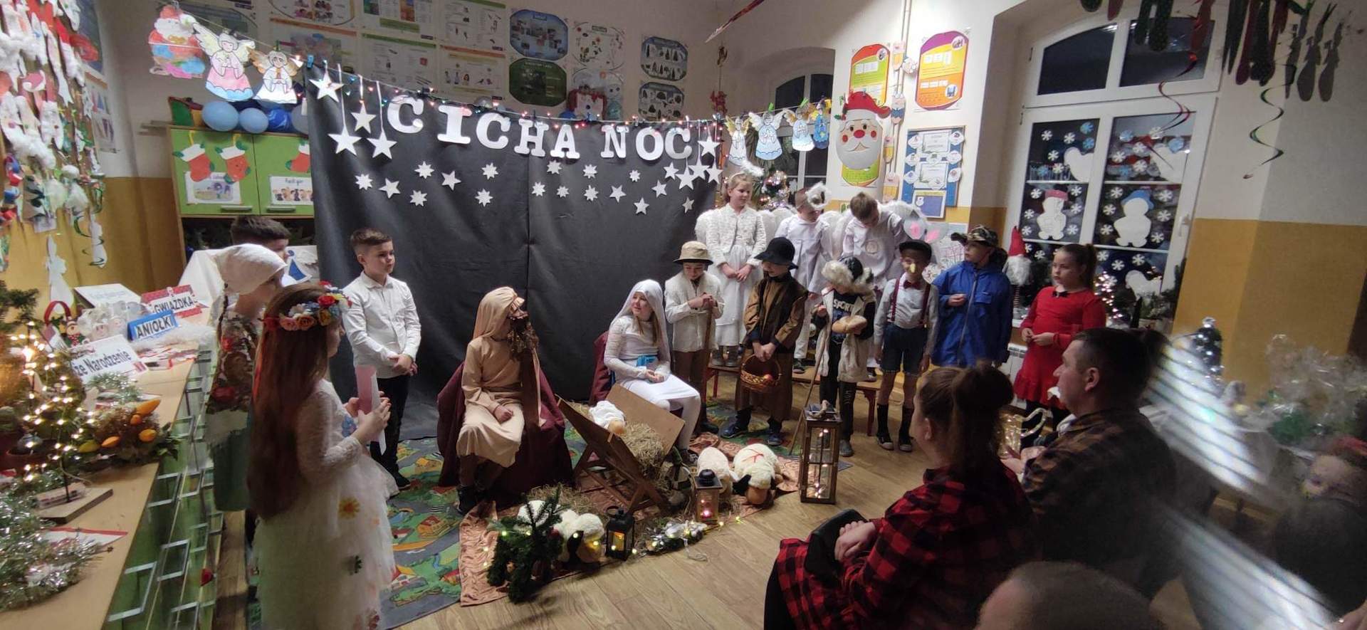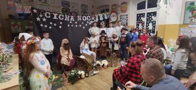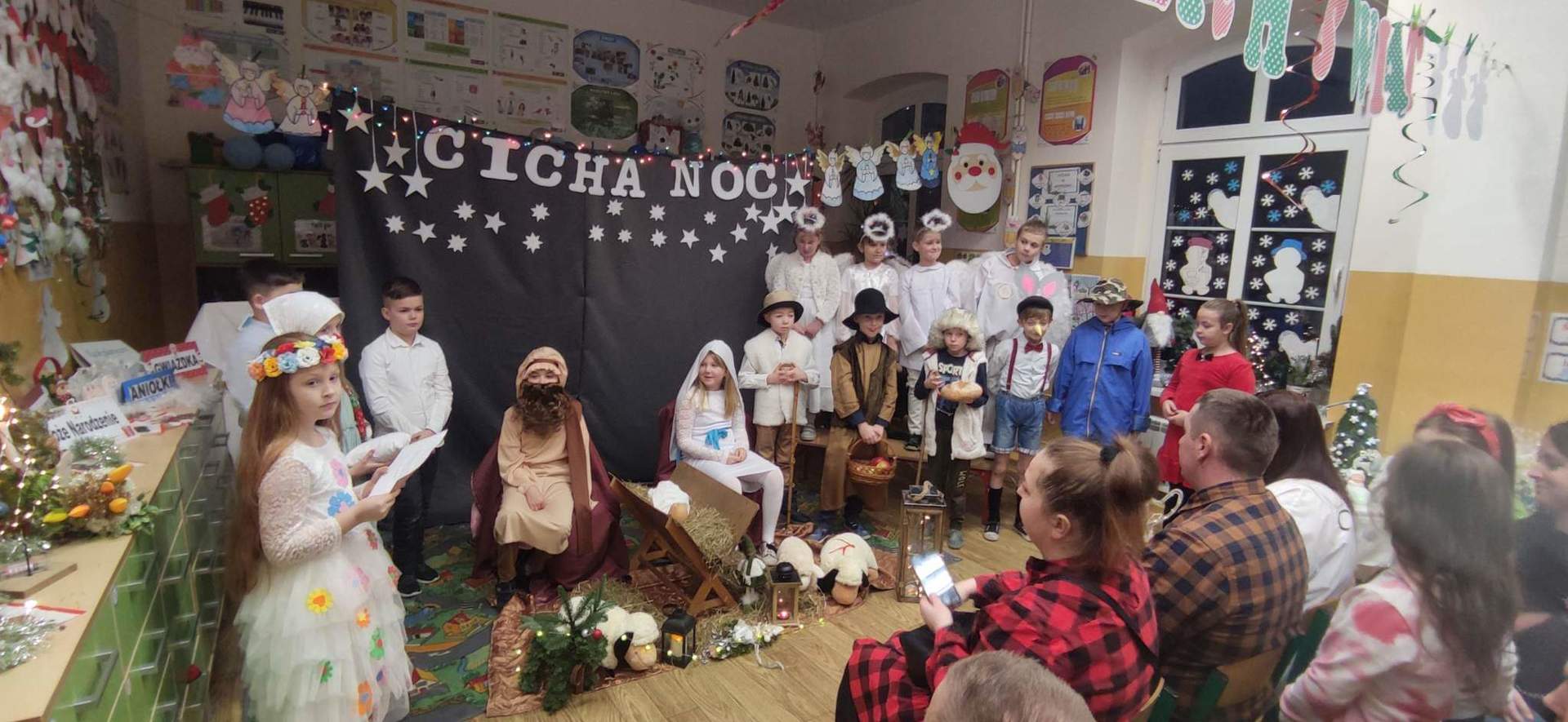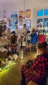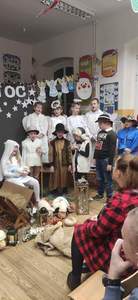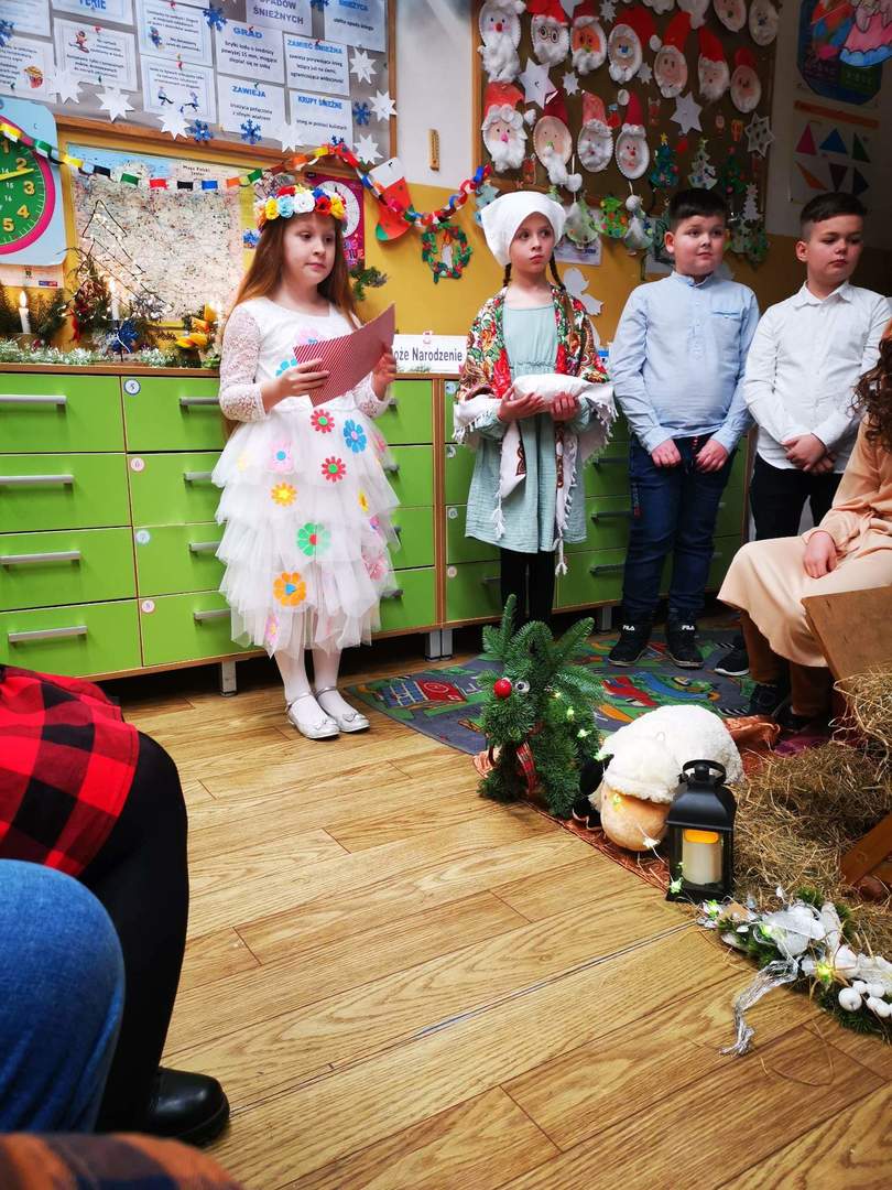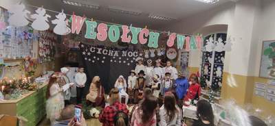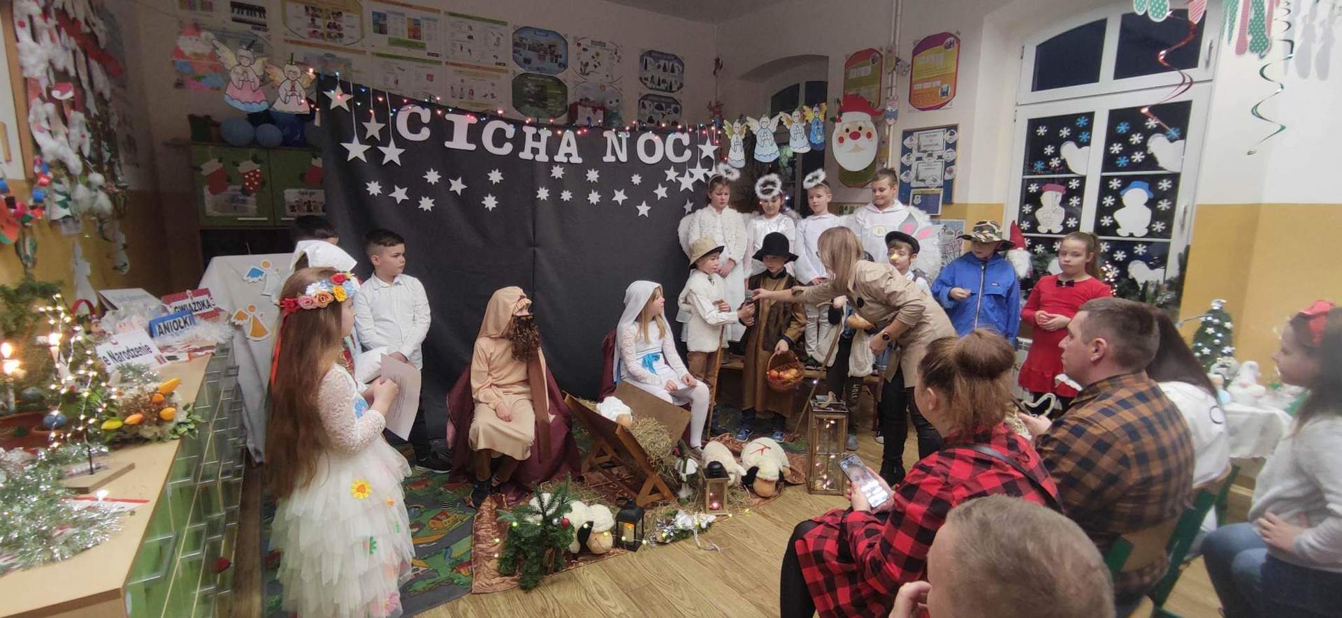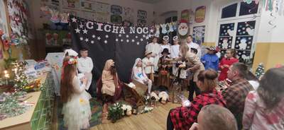 We wtorek 20 grudnia odbyły się jasełka „Betlejemska dobranocka” przygotowane przez uczniów klasy II b. Dzieci z dużym zaangażowaniem odgrywały swoje role i przeżywały magię Świąt Bożego Narodzenia. Jak powszechnie wiadomo, Święta Bożego Narodzenia są najbardziej rodzinnymi i ciepłymi świętami, pozwalającymi poczuć serdeczność i miłość wszystkich wokół. Wszyscy, zarówno dzieci jak i dorośli z niecierpliwością oczekują jego nadejścia. Uczniowie ku uciesze swoich rodziców, w pięknych strojach przedstawili historię narodzin Dzieciątka Jezus z udziałem bajkowych postaci, takich jak: Czerwony Kapturek, Pinokio, Calineczka, Sierotka Marysia, Jaś i Małgosia, czy Stary Rybak- oprawioną kolędami i pastorałkami. Po przedstawieniu dzieci zaprezentowały swoje zdolności muzyczne grając na dzwonkach wybrane kolędy. Na zakończenie dzieci wręczyły rodzicom przygotowane dla nich upominki.