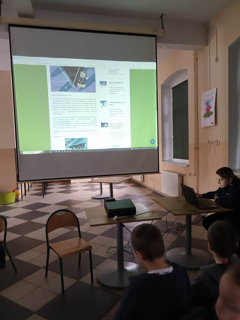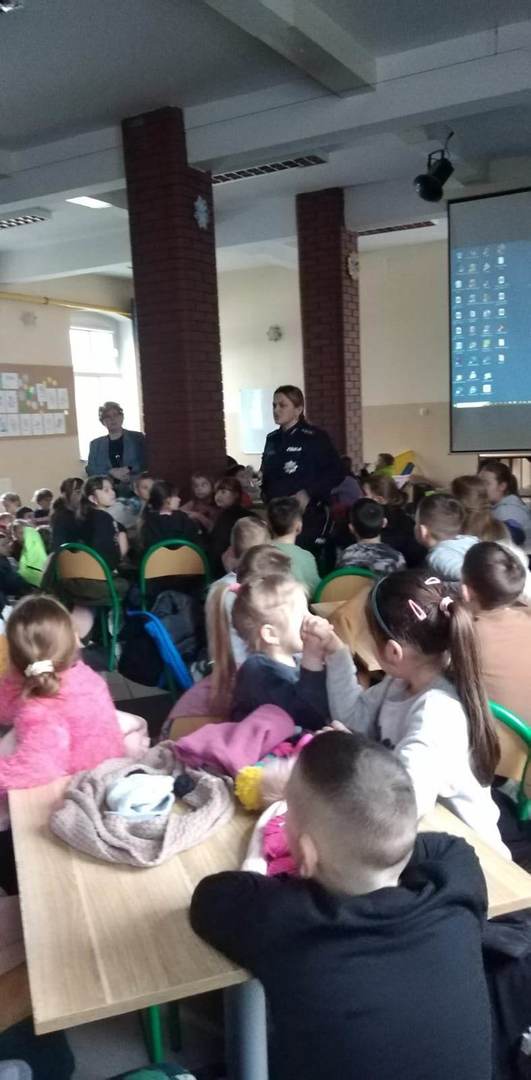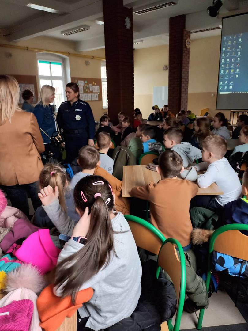 Dbając o bezpieczeństwo naszych uczniów w czasie zbliżających się ferii zimowych, 23 stycznia, odbyło się spotkanie profilaktyczno-edukacyjne z funkcjonariuszami policji dla uczniów kl. I-III. Podczas prelekcji policjanci przypomnieli o zagrożeniach mogących pojawić się w trakcie ferii. Szczególnie skupili się na omówieniu zasad bezpieczeństwa podczas uprawiania sportów zimowych oraz gier i zabaw na świeżym powietrzu. Ważnym elementem spotkania była rozmowa o przestrzeganiu zasad poruszania się po drogach, szczególnie po zmroku, kiedy niezbędne stają się elementy odblaskowe. Policjanci zakończyli spotkanie życząc nam bezpiecznych i udanych ferii zimowych.