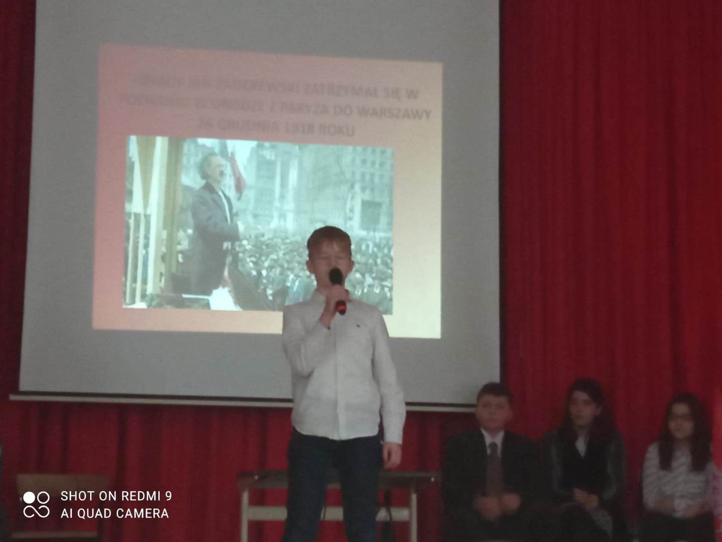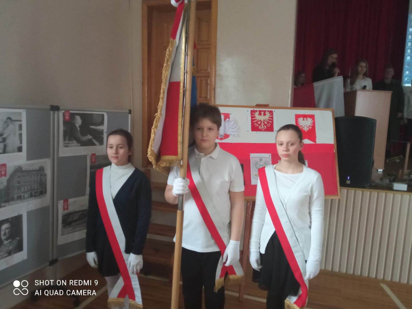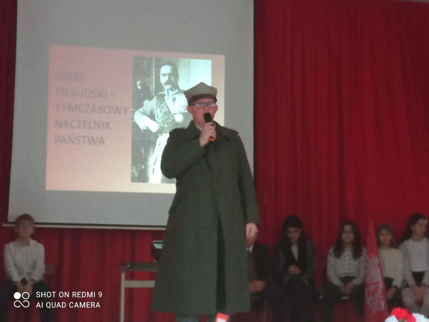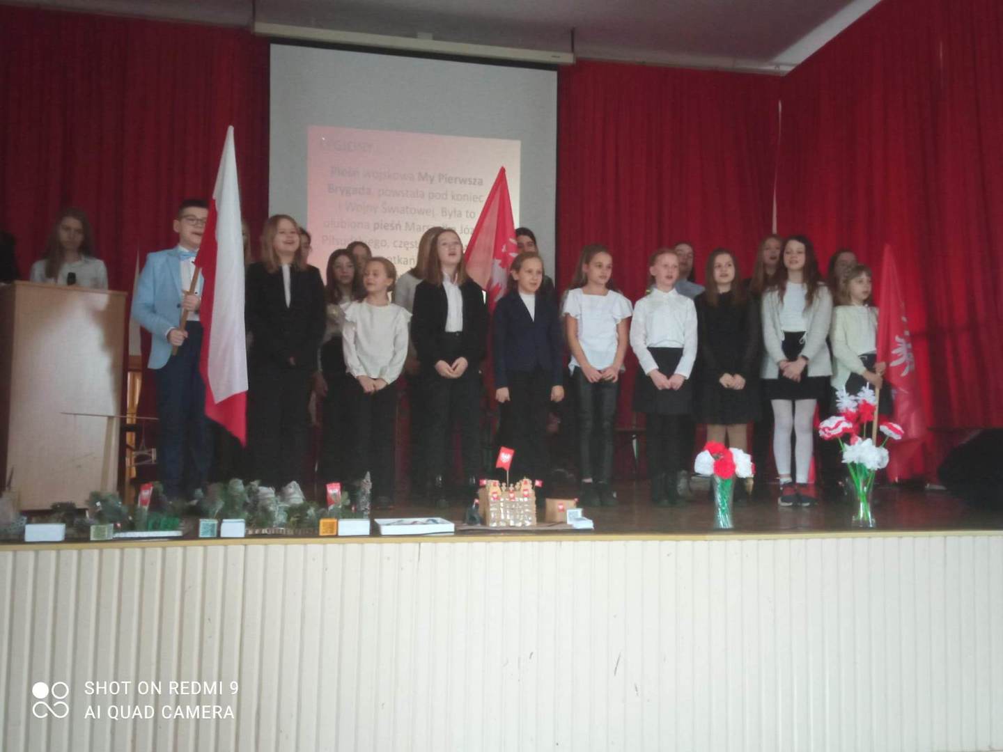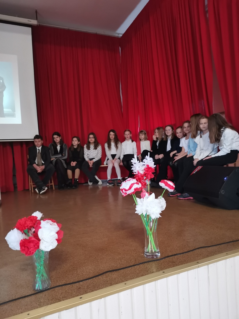 Uroczystość miała bardzo podniosły charakter. Drogę Wielkopolan do wolności przedstawiły uczennice klasy 6c: Zofia Staśkowiak i 8c: Oliwia Marzęcka. Pojawił się na niej Ignacy Jan Paderewski i Józef Piłsudski, w postaci których wcielili się uczniowie klasy 6c. Niepodległościowe wiersze pięknie recytowali uczniowie klas: 4a, 5a, 6a, 6b, i 6c. Pieśni z czasów I wojny światowej zaśpiewał chórek szkolny do którego należą uczennice i uczniowie z klas 4-6. Wszystkim występującym pięknie gratulujemy występu i zaangażowania w przygotowanie uroczystości.