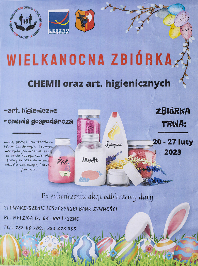 We współpracy ze Stowarzyszeniem Leszczyński Bank Żywności ponownie organizujemy w naszej szkole, w dniach od 20.02. 2023r. do 27.02.202r., ”Wielkanocną Zbiórkę Chemii i art. higienicznych" dla rodzin potrzebujących.. Zbieramy mydło, pasty, żel do mycia, szampon, maszynki jednorazowe, płyny do mycia naczyń, szyb, WC, podłóg, proszek do prania, mleczko czyszczące, gąbki i ścierki do sprzątania. Środki czystości zbieramy w budynku A w sali nr 3, a w budynku C w gabinetach pedagoga i psychologa. Zebrane produkty trafia do paczek dla osób samotnych i seniorów również w naszej gminie. Nie raz pokazaliście, że macie WIELKIE SERCE i można na Was liczyć.