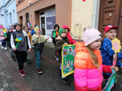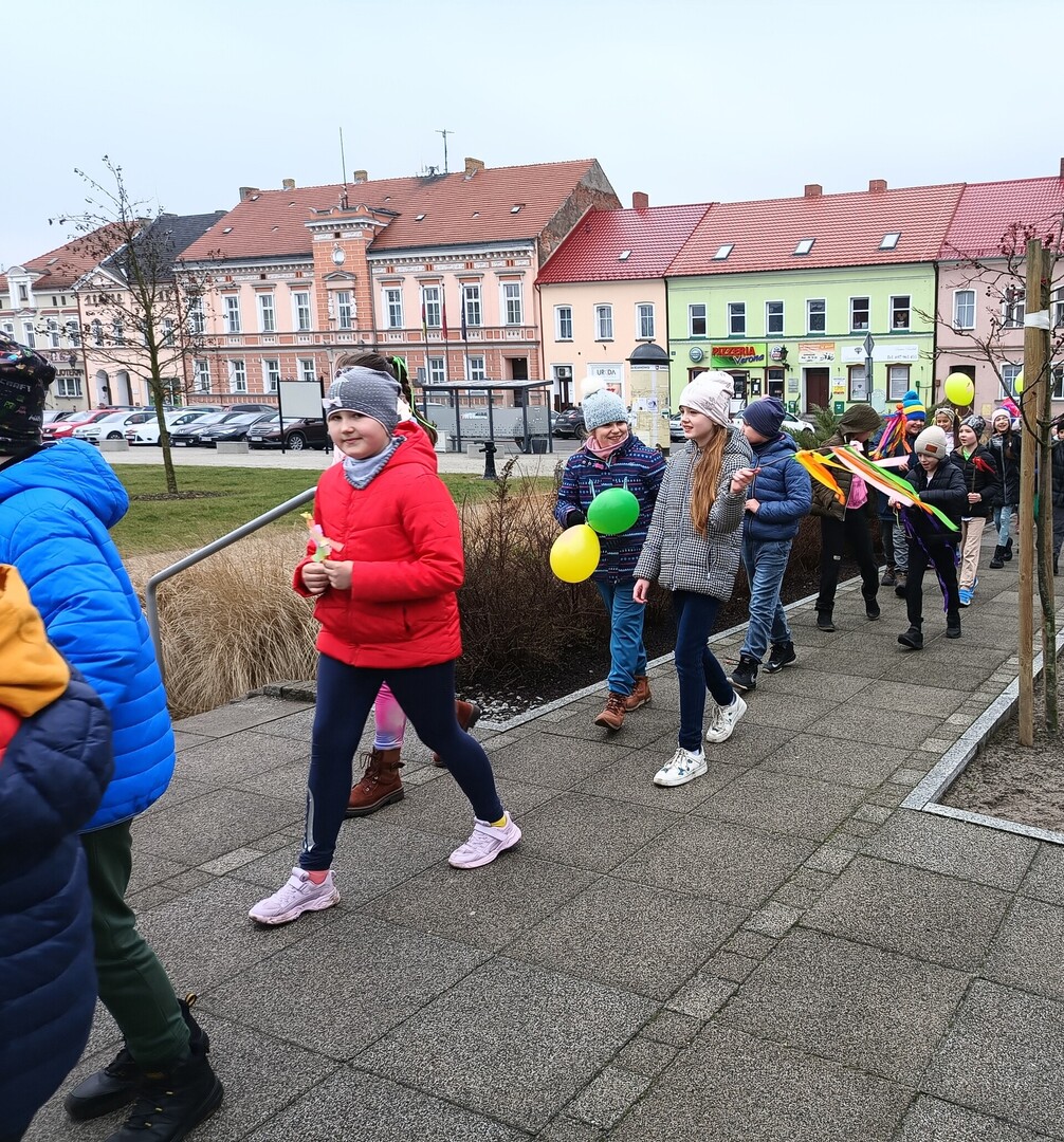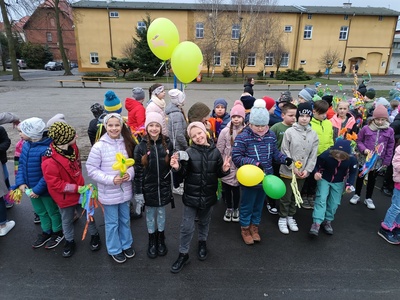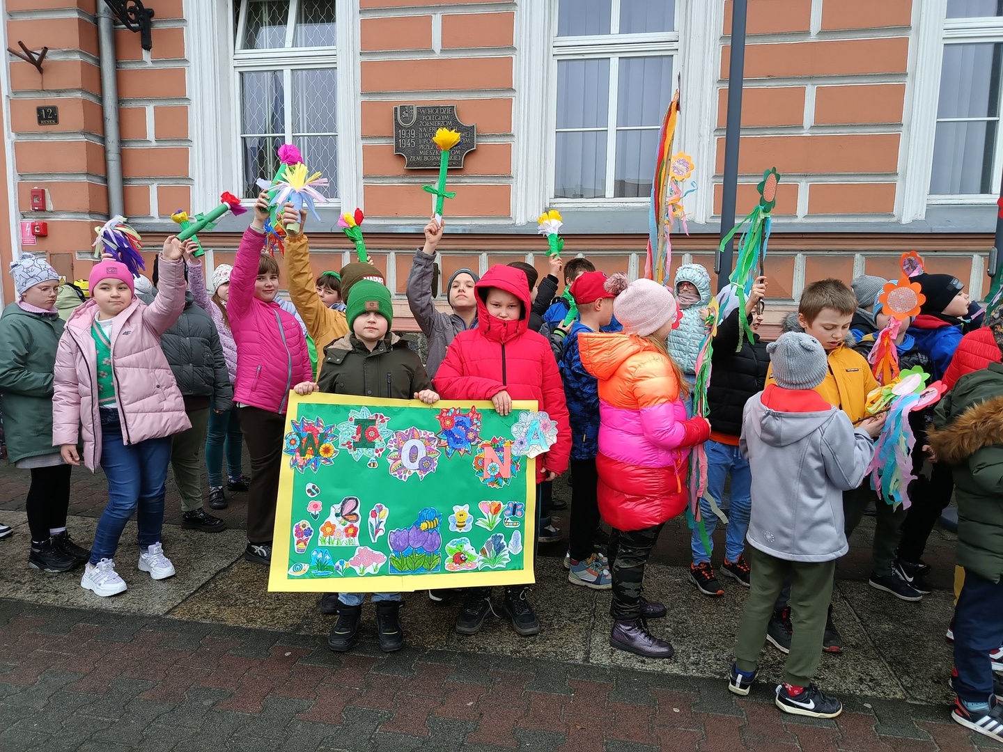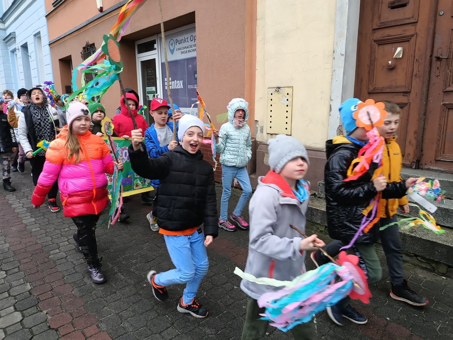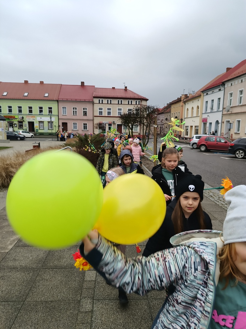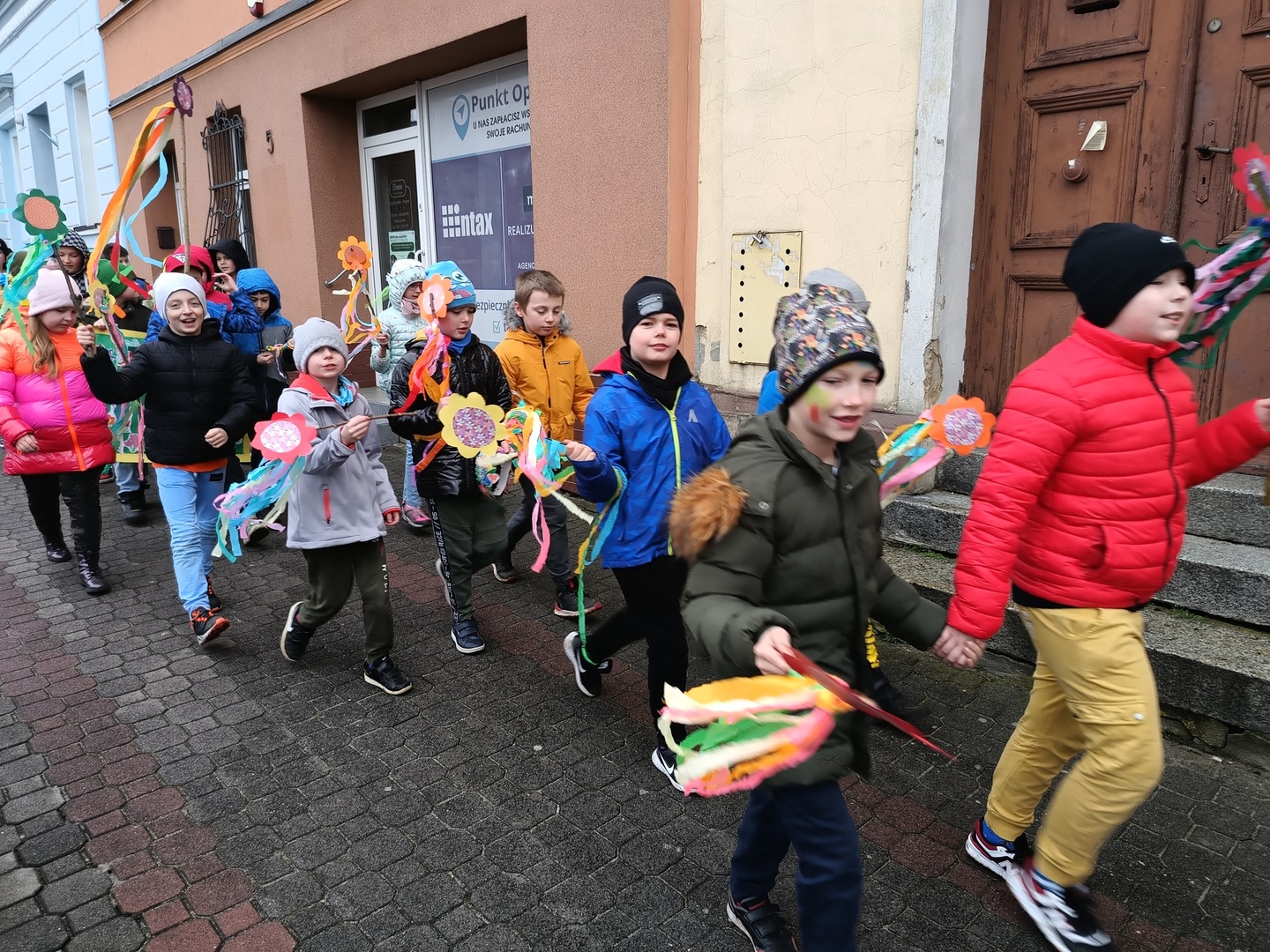 Uroczyste powitanie Wiosny rozpoczęło się od kolorowego korowodu uczniów i nauczycieli ulicami Bojanowa, na czele którego uczniowie kl.3 nieśli Marzannę, przygotowaną z ekologicznych materiałów. Wszyscy uczniowie mieli piękne wiosenne, kolorowe gaiki, kwiaty, żółte i zielone baloniki a na twarzach gościł uśmiech i radość. Maszerując wokół Rynku śpiewali wiosenne piosenki i wznosili okrzyki: "Precz zimo zła!", " Witaj Wiosno!" itp. Dzisiejszy dzień, to "Dzień kolorowej skarpetki"- w związku obchodami Światowego Dnia Osób z Zespołem Downa i dlatego wszyscy nasi uczniowie mieli dzisiaj kolorowe skarpetki nie do pary, by pokazać tym osobom i ich bliskim akceptację, aprobatę i wsparcie.