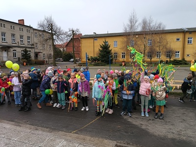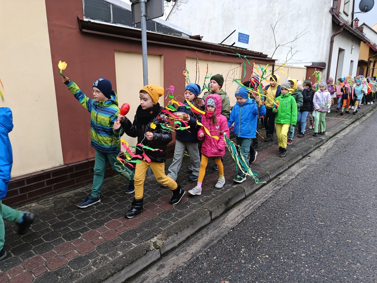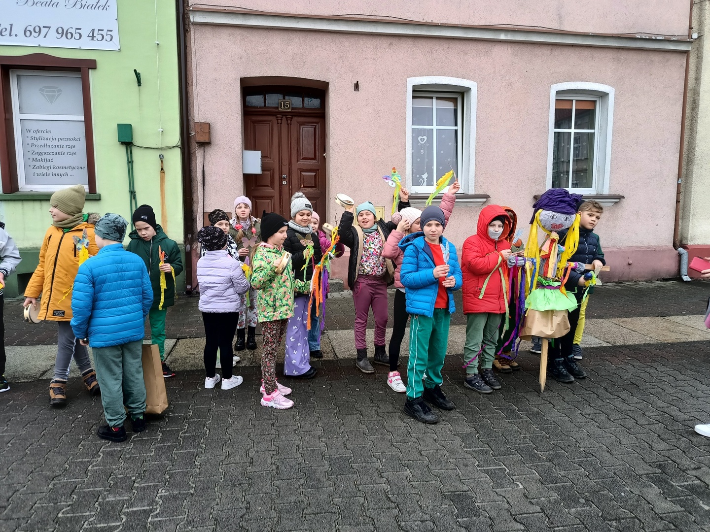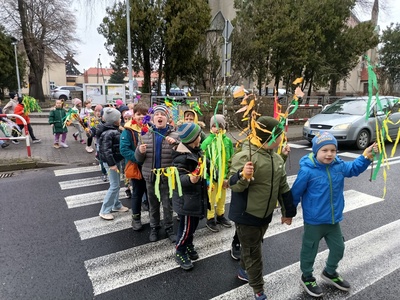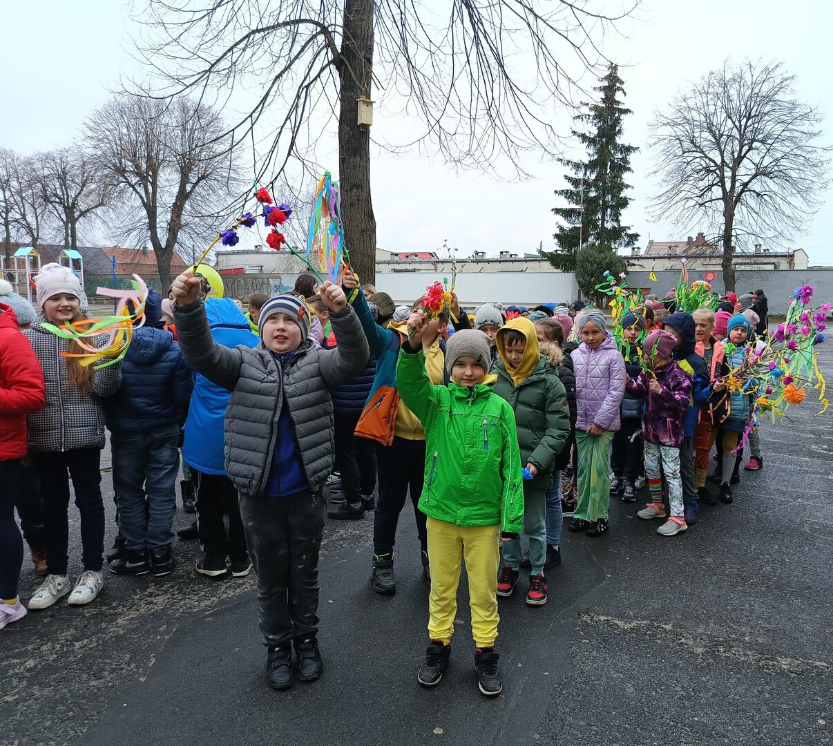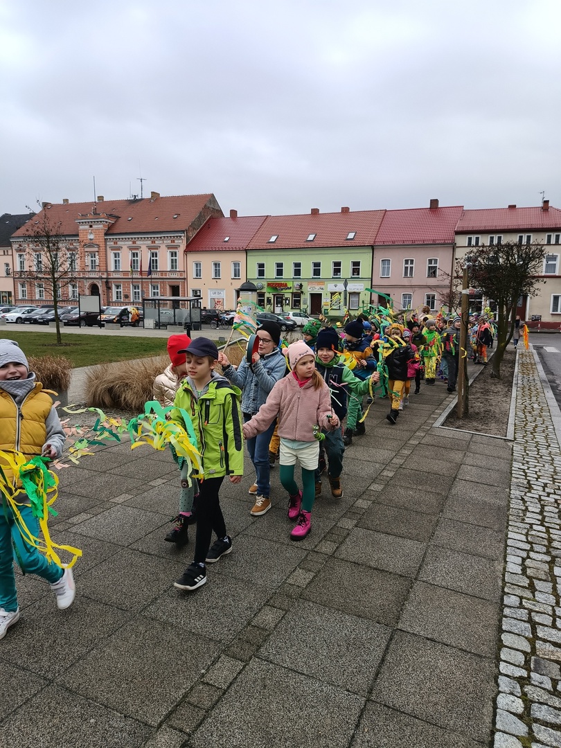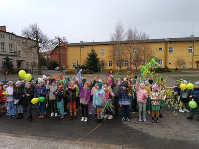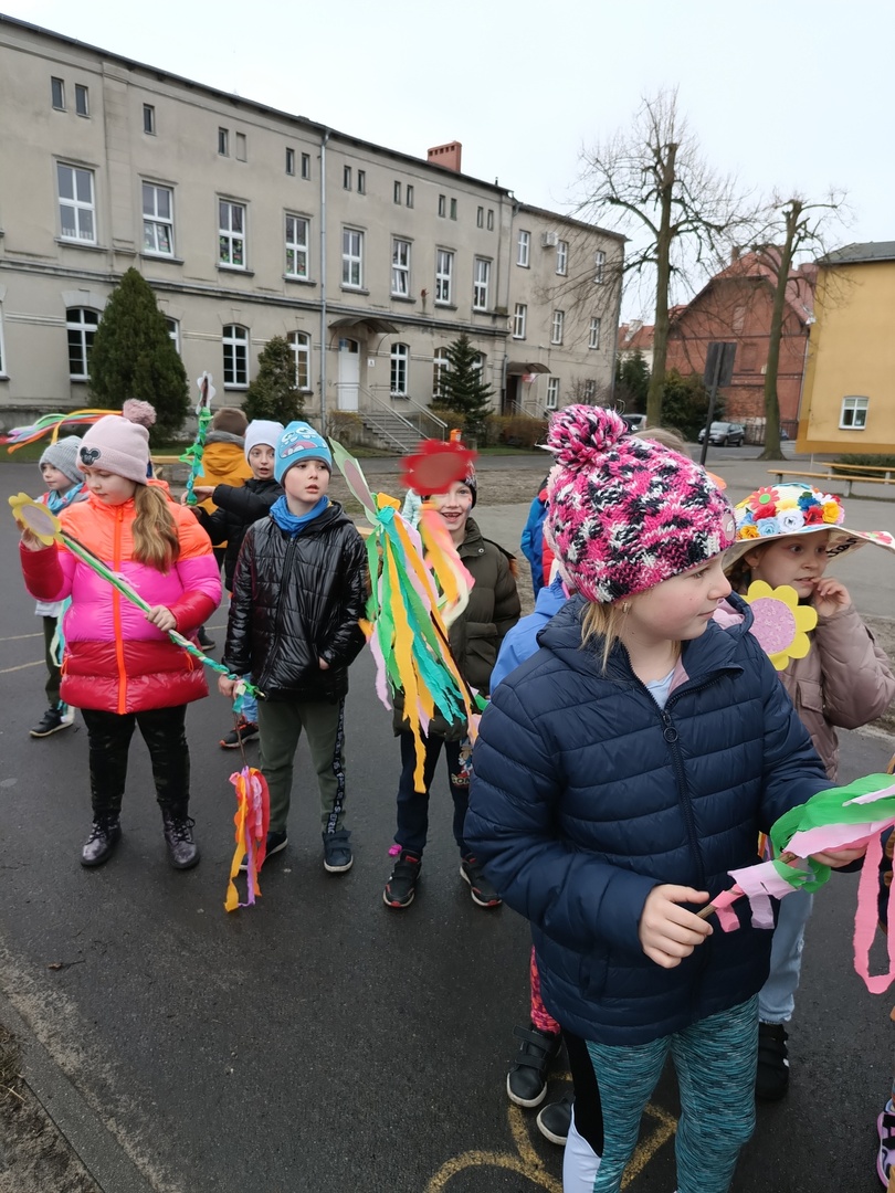 Uroczyste powitanie Wiosny rozpoczęło się od kolorowego korowodu uczniów i nauczycieli ulicami Bojanowa, na czele którego uczniowie kl.3 nieśli Marzannę, przygotowaną z ekologicznych materiałów. Wszyscy uczniowie mieli piękne wiosenne, kolorowe gaiki, kwiaty, żółte i zielone baloniki a na twarzach gościł uśmiech i radość. Maszerując wokół Rynku śpiewali wiosenne piosenki i wznosili okrzyki: "Precz zimo zła!", " Witaj Wiosno!" itp. Dzisiejszy dzień, to "Dzień kolorowej skarpetki"- w związku obchodami Światowego Dnia Osób z Zespołem Downa i dlatego wszyscy nasi uczniowie mieli dzisiaj kolorowe skarpetki nie do pary, by pokazać tym osobom i ich bliskim akceptację, aprobatę i wsparcie.