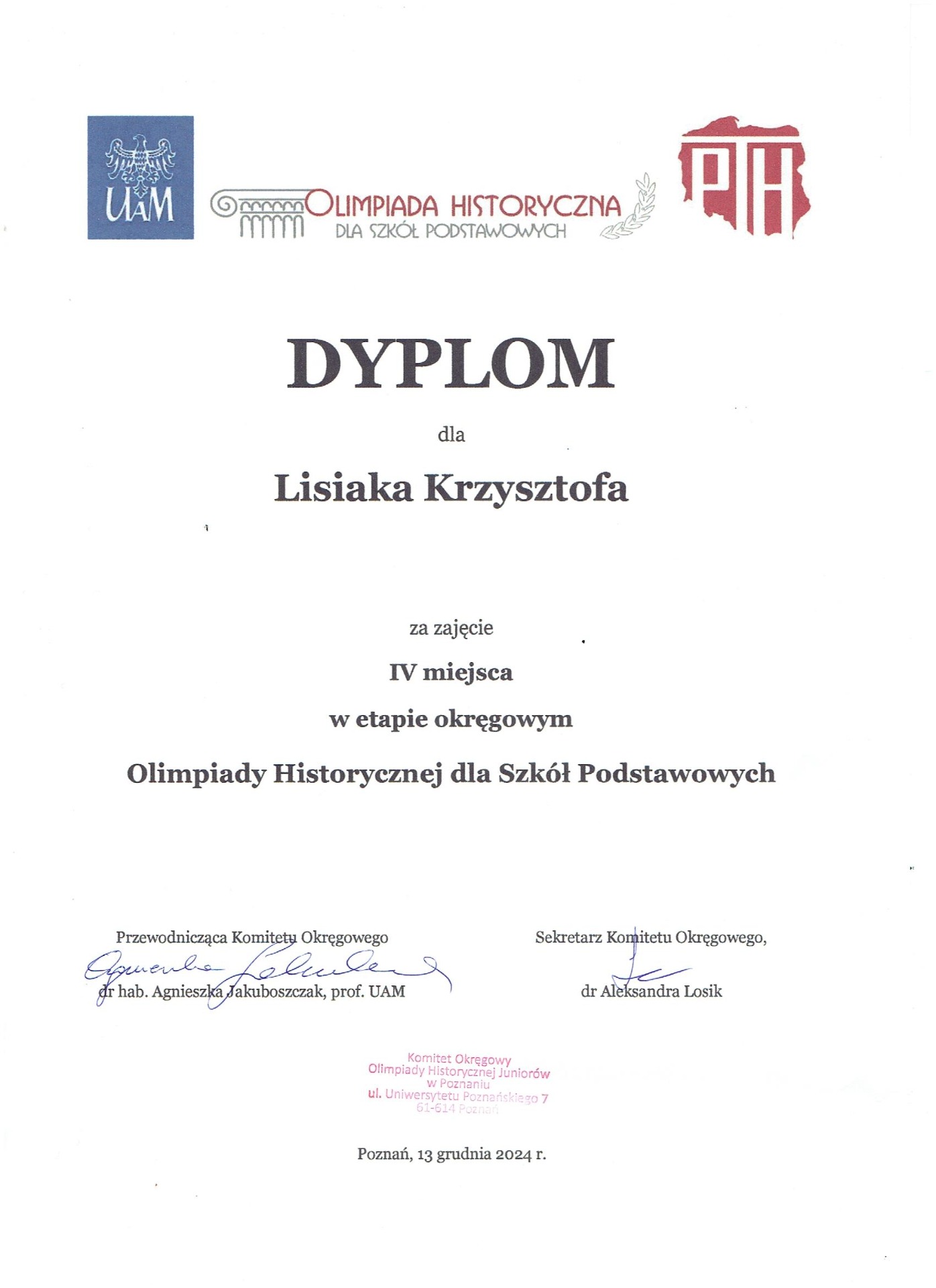 W dniu 13 grudnia Krzysztof Lisiak uczestniczył w II części eliminacji okręgowych(część ustna) Olimpiady Historycznej, organizowanej przez Polskie Towarzystwo Historyczne. Eliminacje odbywały się na Wydziale Historii UAM w Poznaniu.