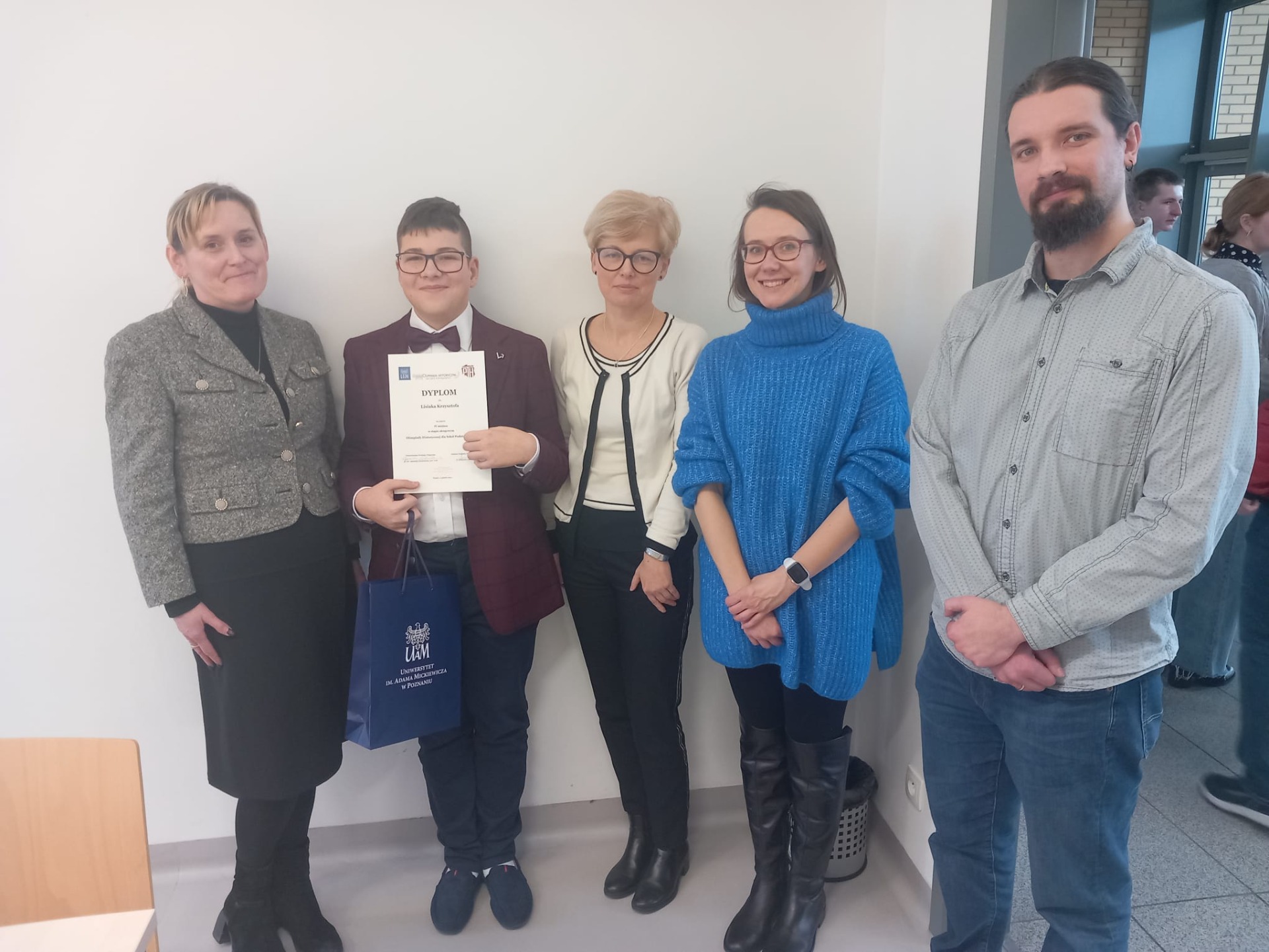 Jak informowaliśmy nasz zdolny uczeń wcześniej zakwalifikował się do tej części olimpiady po rozwiązaniu ze świetnym wynikiem zadań pisemnych 29 listopada. W dniu wczorajszym Krzysiu odpowiadał ustnie przed komisją w składzie której byli profesorowie Uniwersytetu Adama Mickiewicza w Poznaniu. Wypowiedź składała się z trzech części: pierwsza to ustne zaprezentowane przez uczestnika jednego z wybranych zagadnień - Krzysiu przygotował ambitne zagadnienie "Blaski i cienie II RP". Następnie odpowiadał na pytania stawiane przez członków komisji, związane z przedstawionym tematem. Trzecia część to
