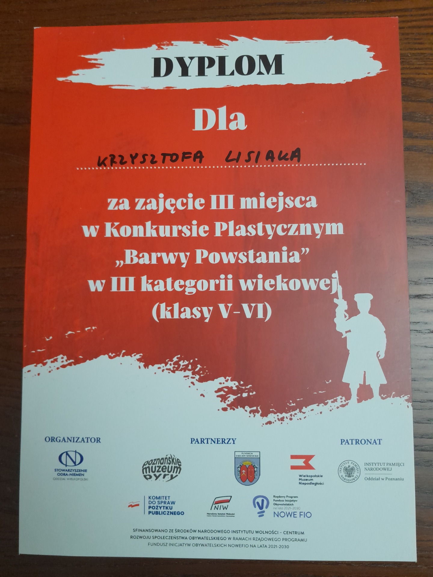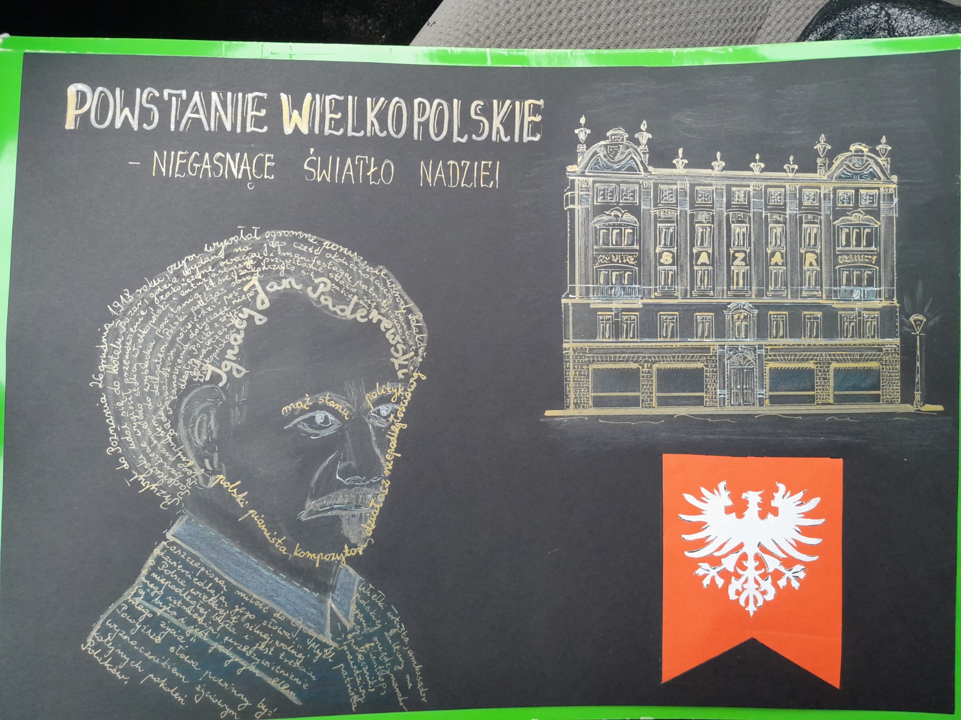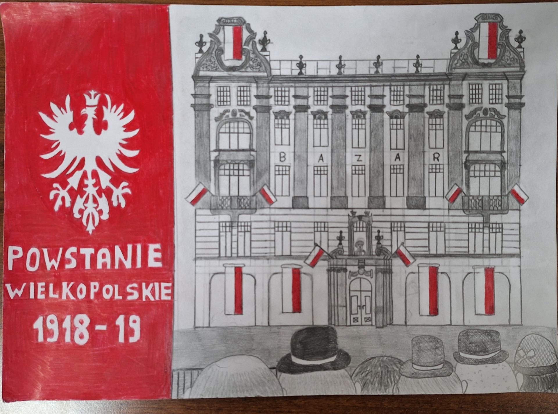Kilka dni temu obchodziliśmy 106 rocznice wybuchu Powstania Wielkopolskiego. Zachęcaliśmy uczniów do udziału w konkursie plastycznym "Barwy Powstania", organizowanym przez Stowarzyszenie Odra-Niemen Oddział Wielkopolski. Kilkoro uczniów naszej szkoły przygotowało piękne prace, które prezentujemy poniżej. Wśród tych uczniów byli: Sandra Ptak, Michał Aleksandrzak, Szymon Aleksandrzak, Szymon Kasprowiak i Krzysztof Lisiak.