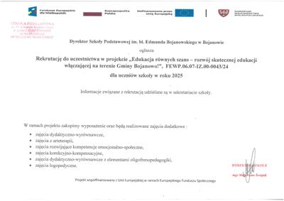 Rekrutacja do uczestniczenia w projekcie "Edukacja równych szans - rozwój skutecznej edukacji włączającej na terenie Gminy Bojanowo!" Zdjęcia Załączniki Załącznik nr 3 Informacja dot. przetwarzania danych osob. dla osób zaangażowanych w projekty-1 [53.95 kB] Załącznik nr 2b Deklaracja udziału - dla rodzica [49.07 kB] Załącznik nr 1a Formularz rekrutacyjny ucznia [163.92 kB] Załącznik nr 2a Deklaracja udziału - dla ucznia [49.66 kB] Załącznik nr 1 Formularz rekrutacyjny rodzica(2) [161.12 kB] Regulamin rekrutacji (1) [60.10 kB] Zobacz również Terminy konsultacji dla rodziców i uczniów - styczeń... Wesołych Świąt! Mamy laureata konkursu plastycznego "Barwy Powstania" Rekrutacja do uczestniczenia w projekcie "Edukacja... Korekta w kursowaniu autobusów w dniu 15 stycznia... Zapisy do klasy 1 03 stycznia 2025 Aktualności Wydrukuj Udostępnij Wyświetlono: 241