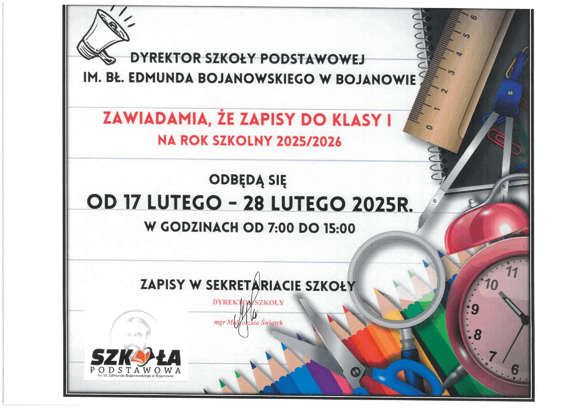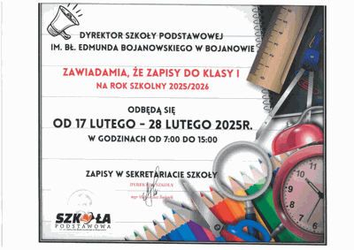Zapisy do klasy 1 Zdjęcia Zobacz również Mamy laureata konkursu plastycznego "Barwy Powstania" Rekrutacja do uczestniczenia w projekcie "Edukacja... Korekta w kursowaniu autobusów w dniu 15 stycznia... Zapisy do klasy 1 Terminy konsultacji dla rodziców i uczniów - luty... Terminy kółek zainteresowań w 2 semestrze 03 lutego 2025 Aktualności Wydrukuj Udostępnij Wyświetlono: 141