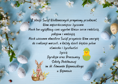 Życzenia świąteczne Zdjęcia Zobacz również Zmiany w kursowaniu autobusów - 21 marca Kursowanie autobusów w Sowinach TERMINY KONSULTACJI DLA RODZICÓW I UCZNIÓW od... Życzenia świąteczne Terminy rekrutacji do szkół ponadpodstawowych... Zmiany w kursowaniu autobusów szkolnych w dniach... 14 kwietnia 2025 Aktualności Wydrukuj Udostępnij Wyświetlono: 80